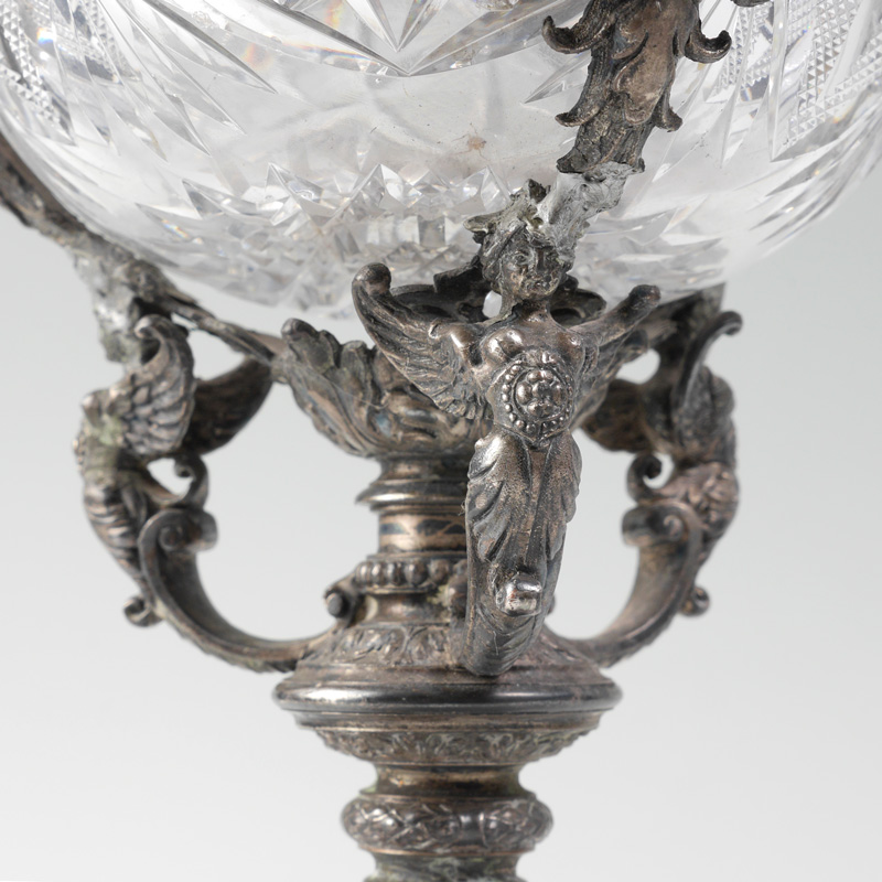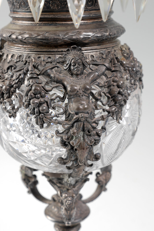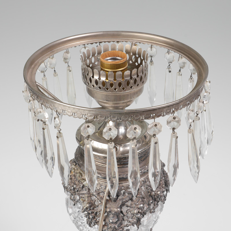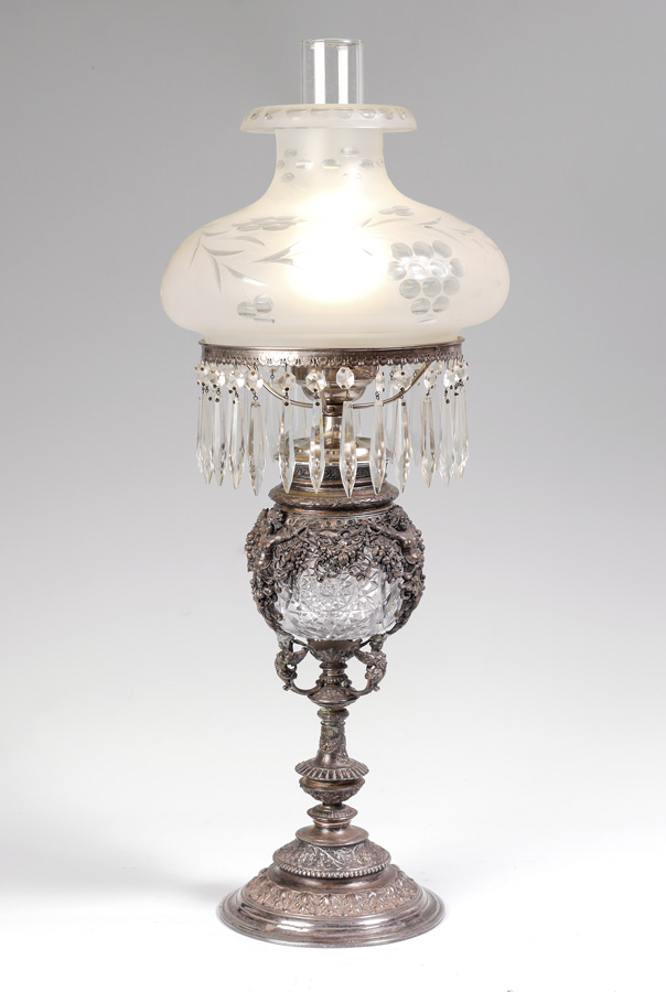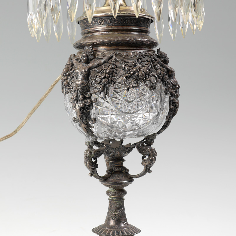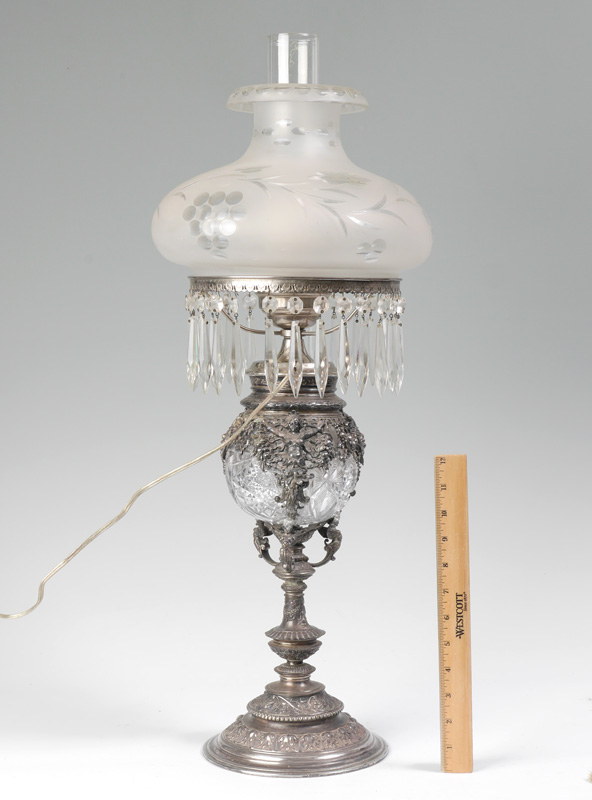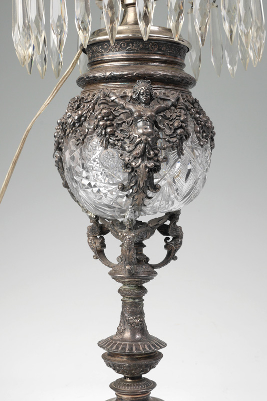 VICTORIAN FIGURAL SILVERPLATE CUT GLASS LAMP: Converted oil lamp, embossed metal base, center column, 3-winged caryatid supports, cut glass reservoir mounted with embossed figural semi-nude women holding garland. Single socket fixture, ring shade support with crystal prism drops. Measures 19 1/2'' h. x 8 1/2''. Frosted and clear cut glass shade, 7 1/2'' h. x 11'' dia, fitter rim 8'', clear chimney.