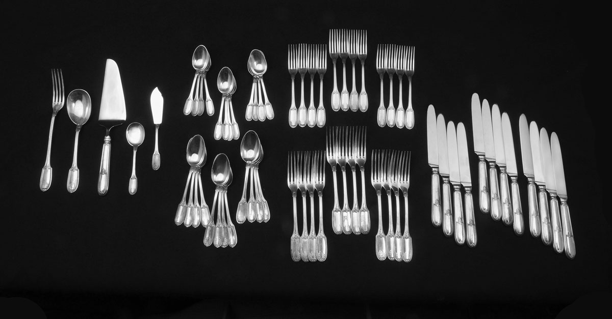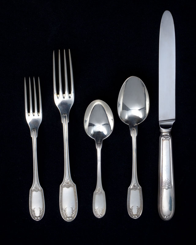 STERLING FLATWARE SERVICE FOR 12 MARKED GH FRANCE: Sterling flatware set with some pieces marked ''Sterling France GH'', others ''925 Sterling France'', approx. 65 pieces to include 12 dinner forks (8 1/4''), 12 salad forks (6 7/8''), 12 teaspoons (5 3/4''), 12 soup spoons (7''), 12 hollow knives (9 3/4''), elongated serving fork (9 5/8''), serving spoon (8''), jelly spoon (5 5/8''), solid master butter knife (6 3/4''), hollow cake server (10 7/8''). Approx. 87.2 troy oz.