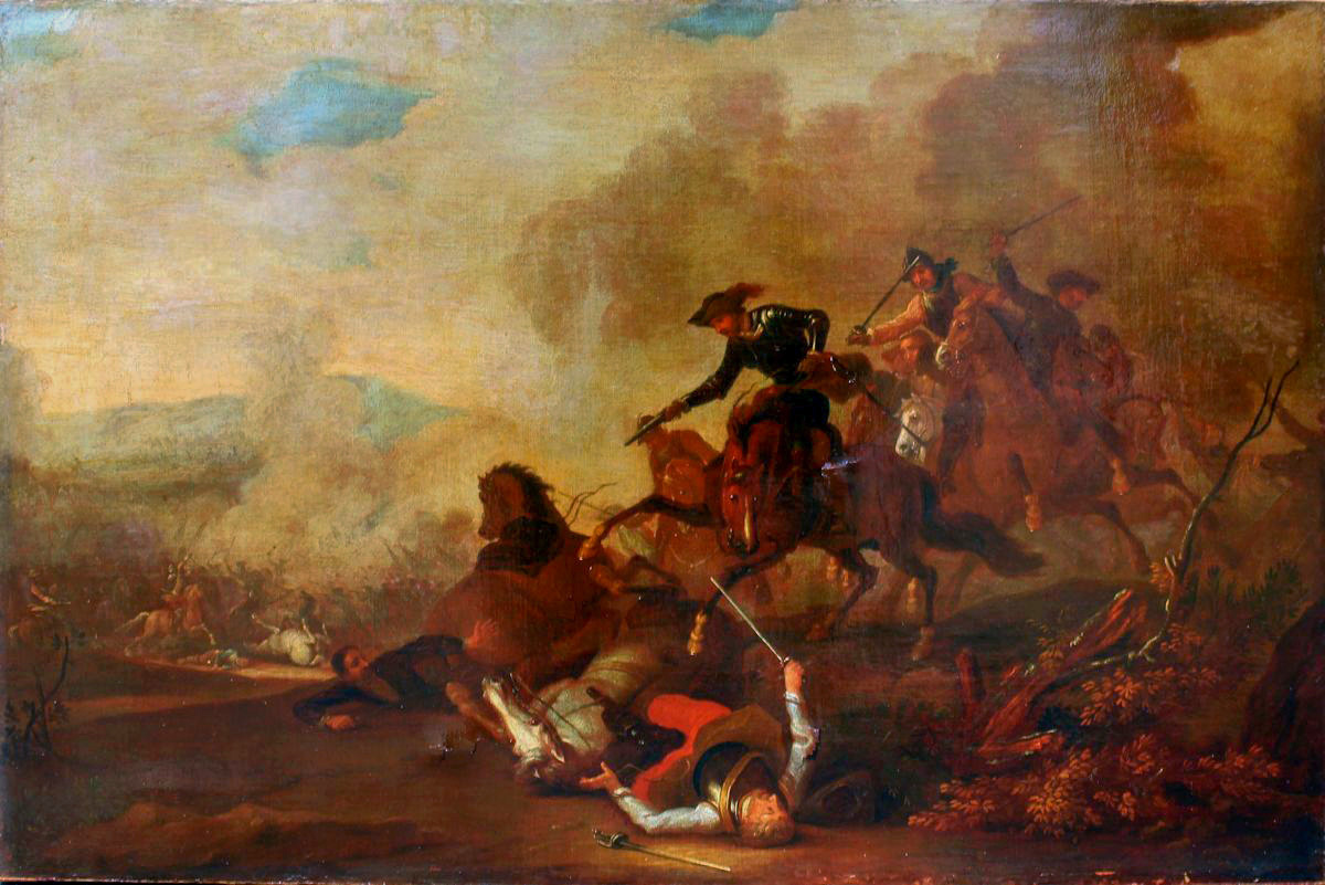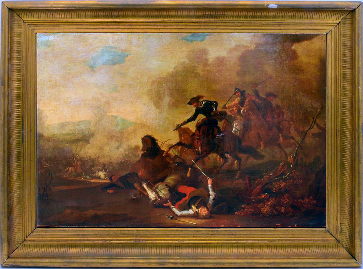 EARLY BATTLE SCENE PAINTING, POSSIBLY JORIS VAN BREDAEL OR CIRCLE OF: Oil/Canvas, 23'' x 34.75'', scene depicts a very involved battle, with soldiers on horseback, firing pistols and waving swords, fallen horses and comrades, possible partial signature lower right, gilded frame, 29'' x 42''. From the estate of Dr. Luciana Maria (Wertheimer Von Ranshofenanshofen) Meyer.