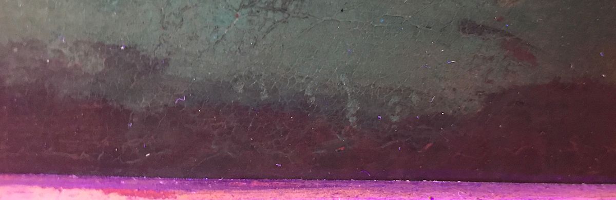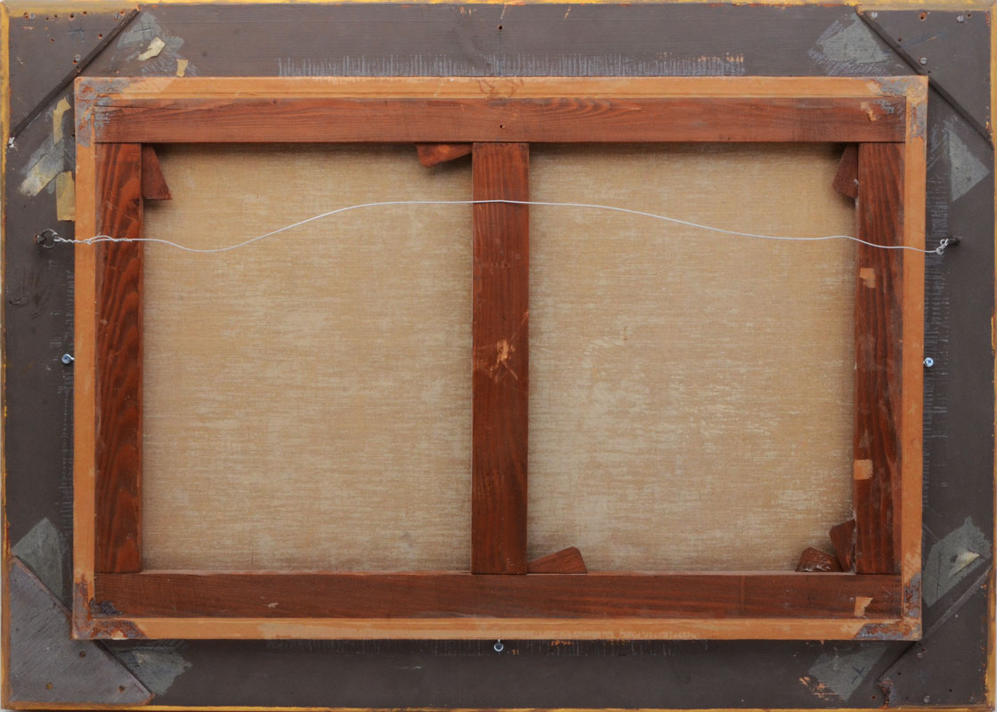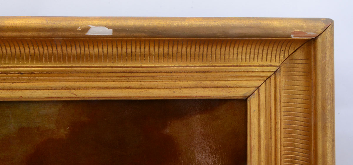CONDITION: Older reline with repair to tear in right margin, several punctures, some scattered touches of inpaint, sporadic craquelure, needs cleaning, frame shows wear, sold as is.