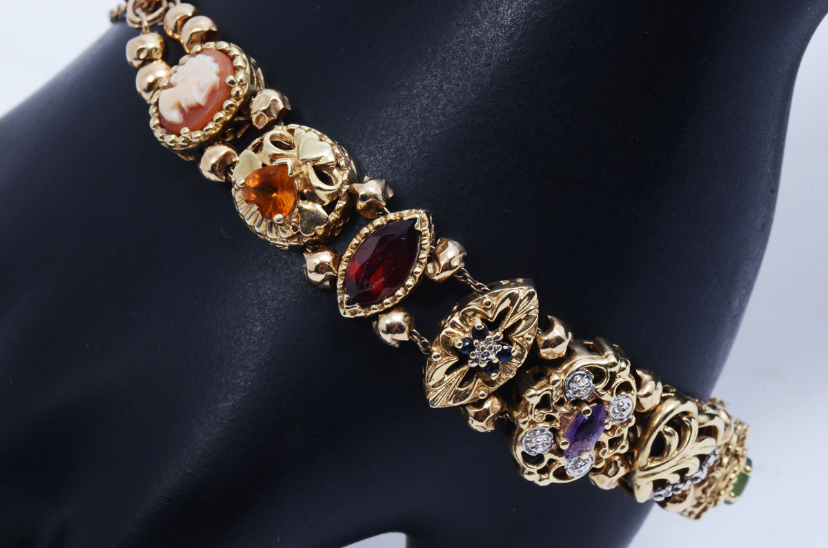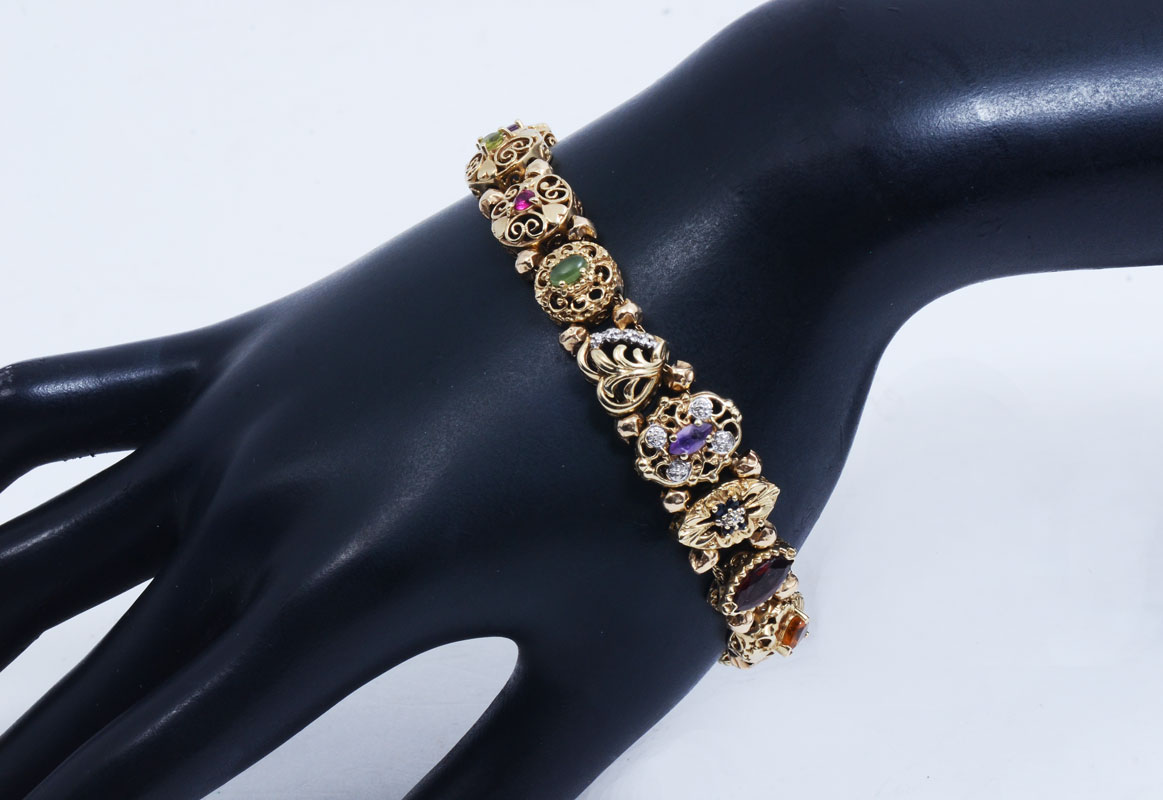 14K MODERN SLIDE BRACELET: 14K yellow gold bracelet with 13 double strung (modern) slides. Slides contain semiprecious and synthetic gemstones. Ball spacers are dented. Approx. Width: 10.00-12.00 mm. Length: 8.0'' Weight: 20.3 grams.