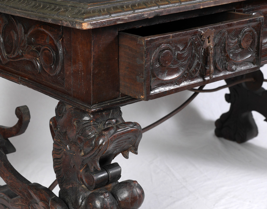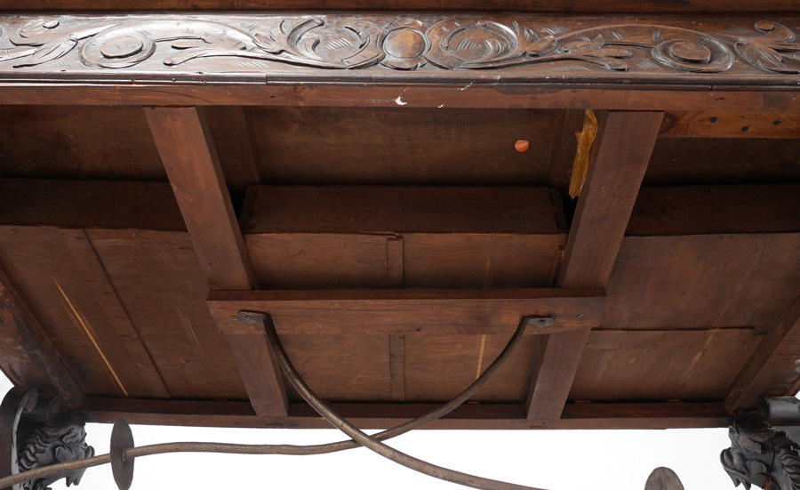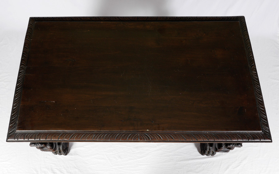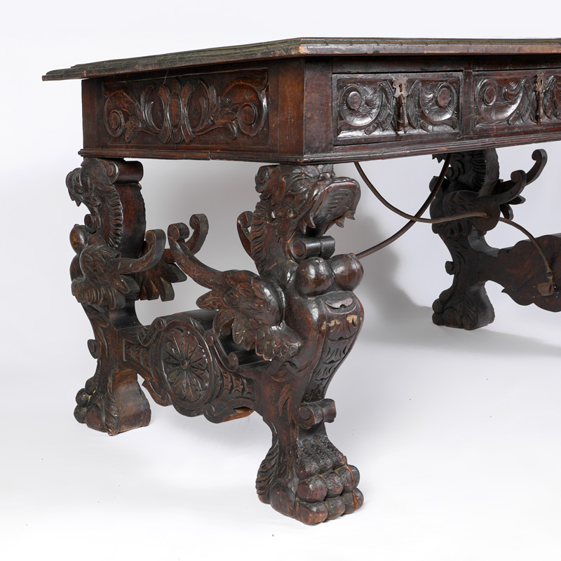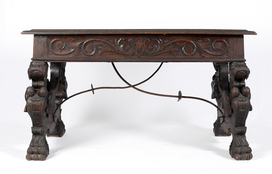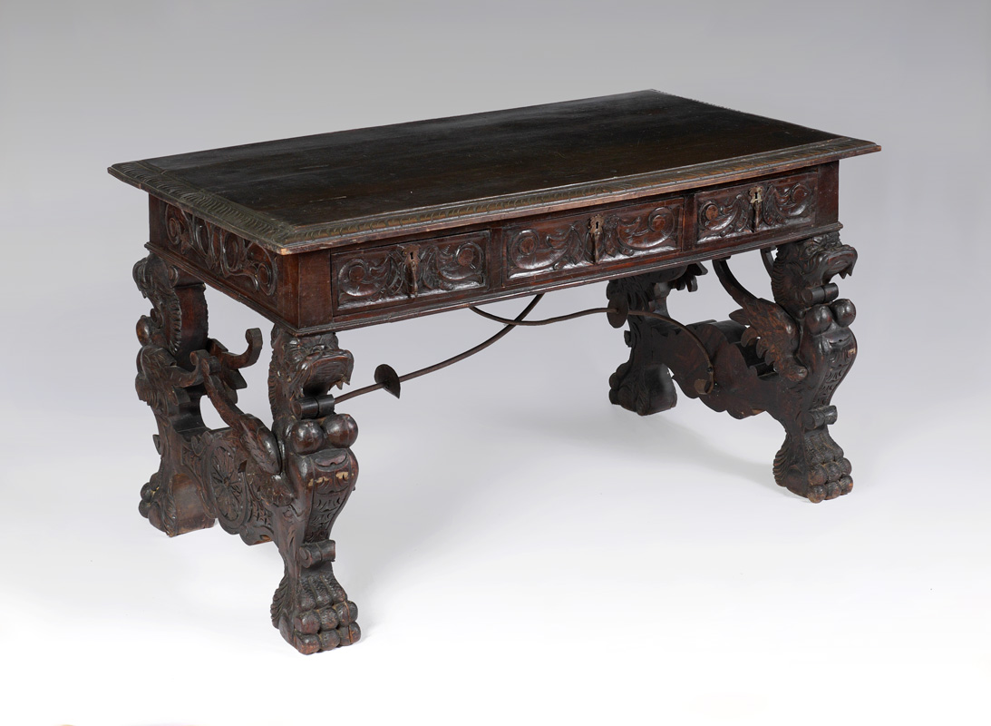 RENAISSANCE REVIVAL CARVED GRIFFIN LIBRARY TABLE: 19th Century library table, planked top, carved border, 3 drawer skirt with foliate carved motifs. Full figure carved griffin supports, shaped stretchers, scroll wrought iron bar, overall 31 1/2'' h. x 55'' x 31''.