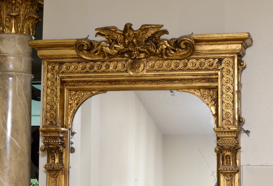 19TH CENTURY RENAISSANCE REVIVAL GILT PIER MIRROR: Giltwood frame with carved and applied accents. Center crest with spread wing eagle, seated musicians and foliate scroll, stepped pediment over carved geometric and floral decorations. Fluted side columns with acanthus leaf tops, base with matching decoration. Center of base with shelf over turned front legs. Overall approx. 107'' h. x 36'' x 12''.