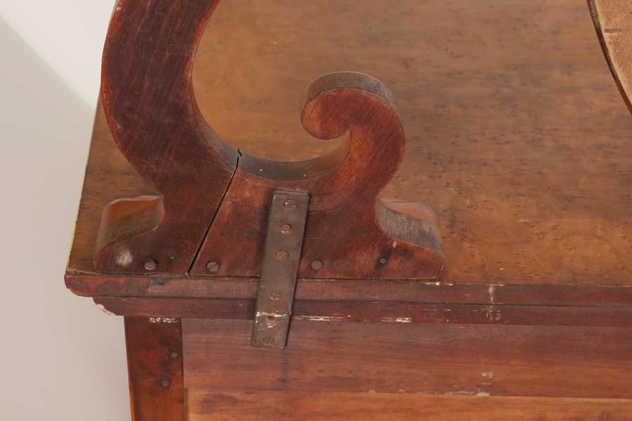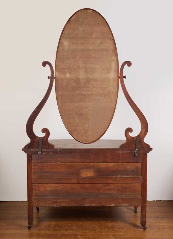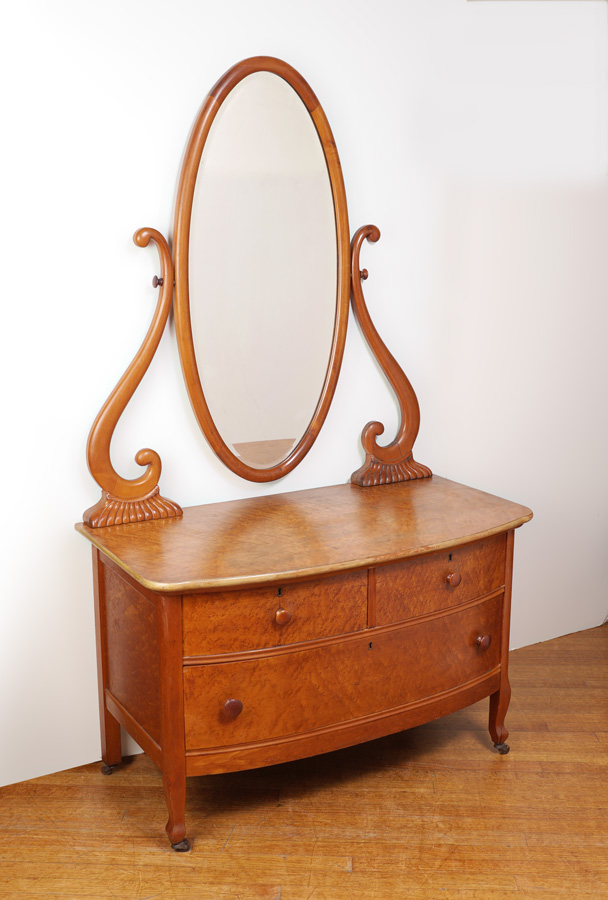 BIRDSEYE MAPLE VANITY WITH MIRROR: Oval mirror with shaped supports, slightly bowed front, 2 half drawers over full length drawer, all on castors. Overall 70 1/2'' h. x 42'' x 22 1/4''.