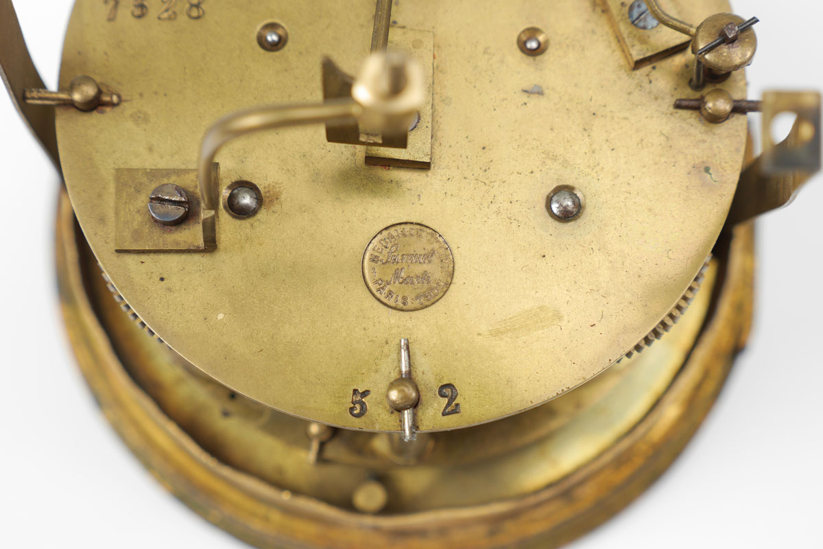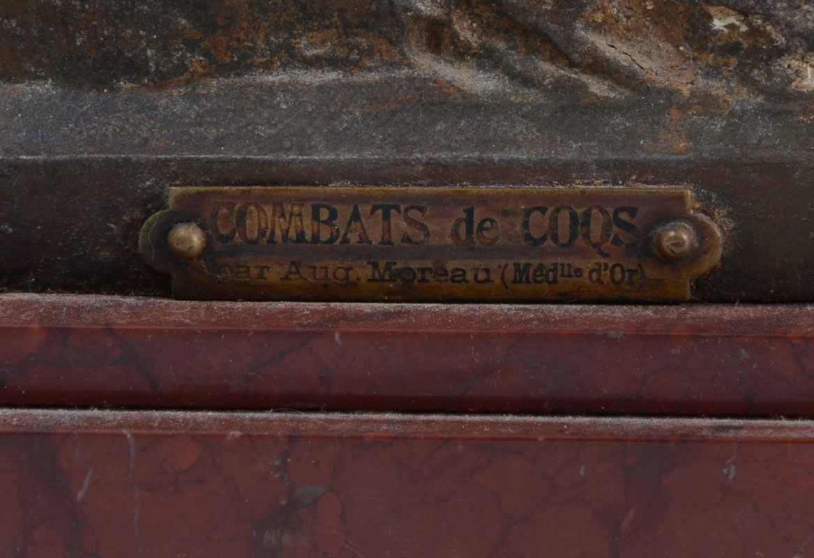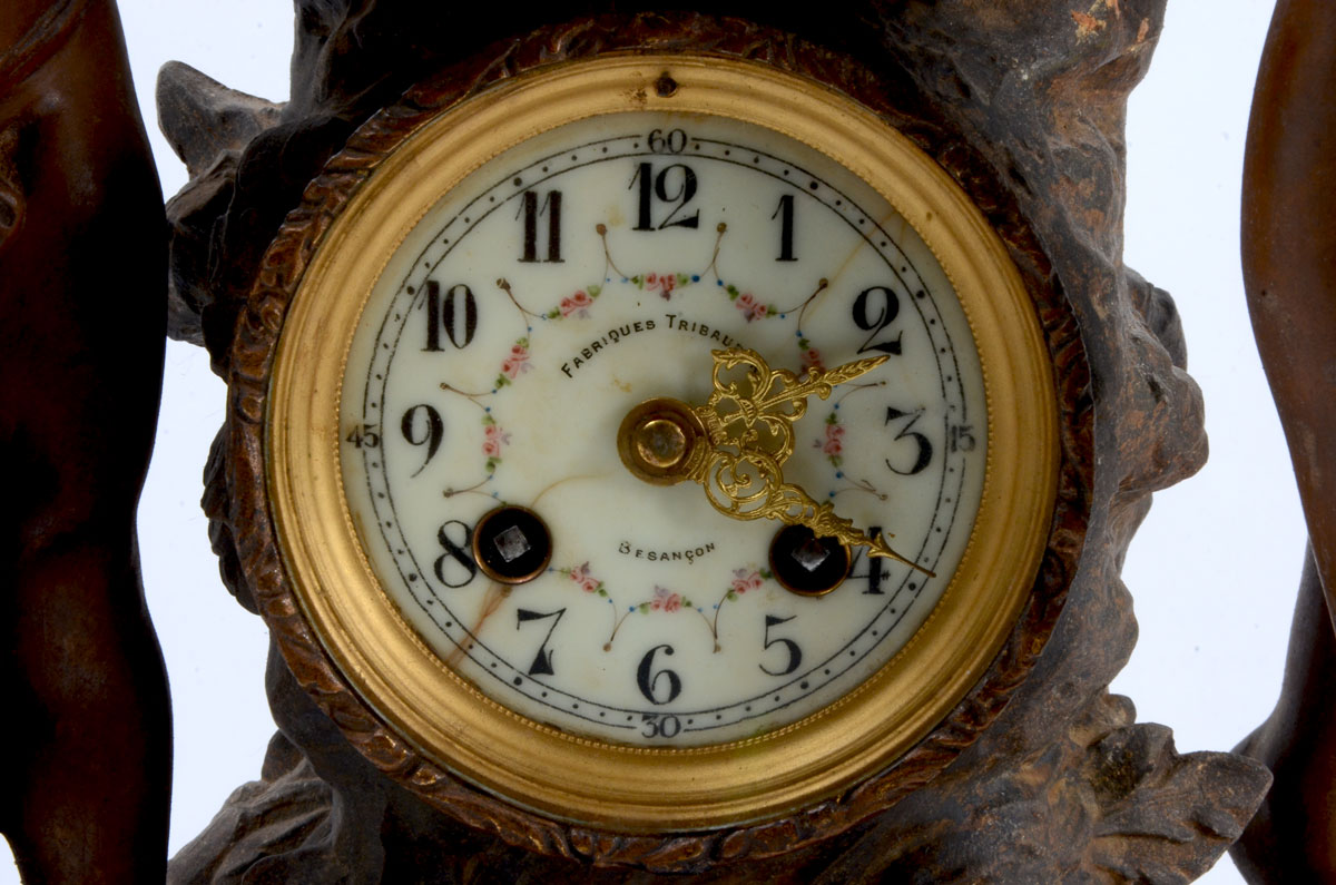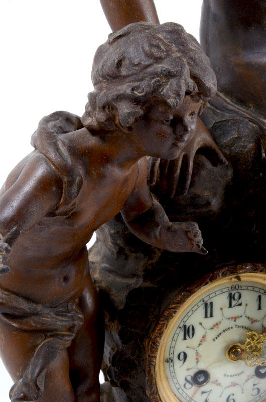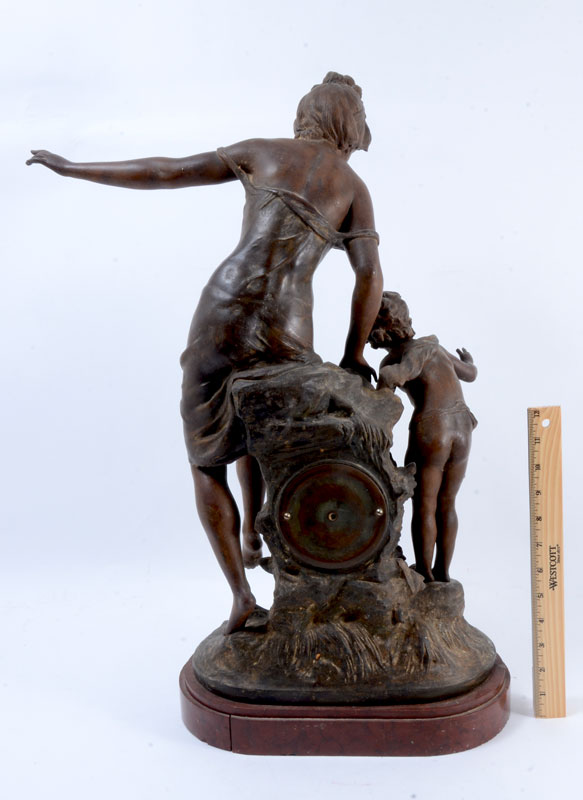 SAMUEL MARTI FRENCH FIGURAL MANTLE CLOCK: Patinated spelter figure of maiden and child with a chicken below after Auguste Moreau titled ''Combats de Coqs'', marble base. Porcelain dial with Arabic numerals, marked Fabriques Tribaudeau Besancon. Samuel Marti signed French movement. Overall measures 25'' h. x 18 1/2'' x 10''.