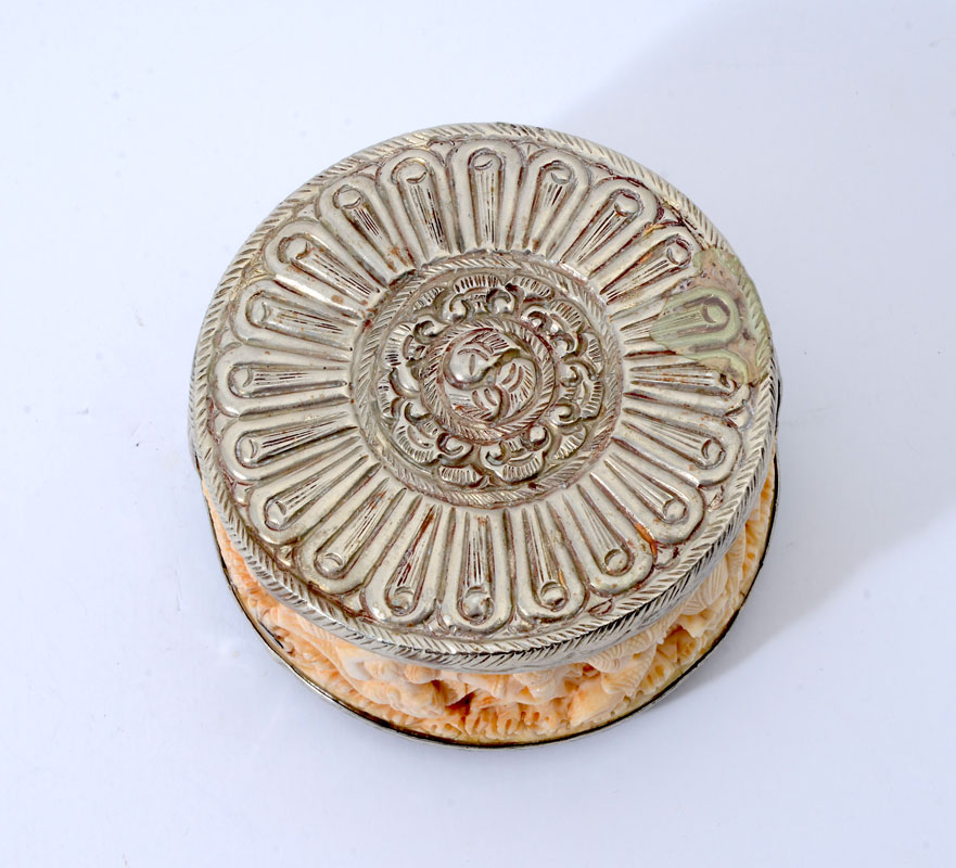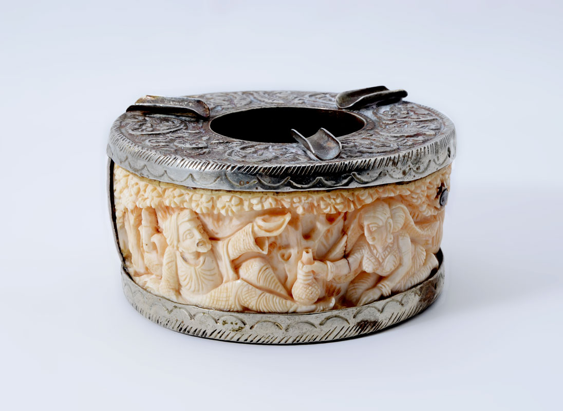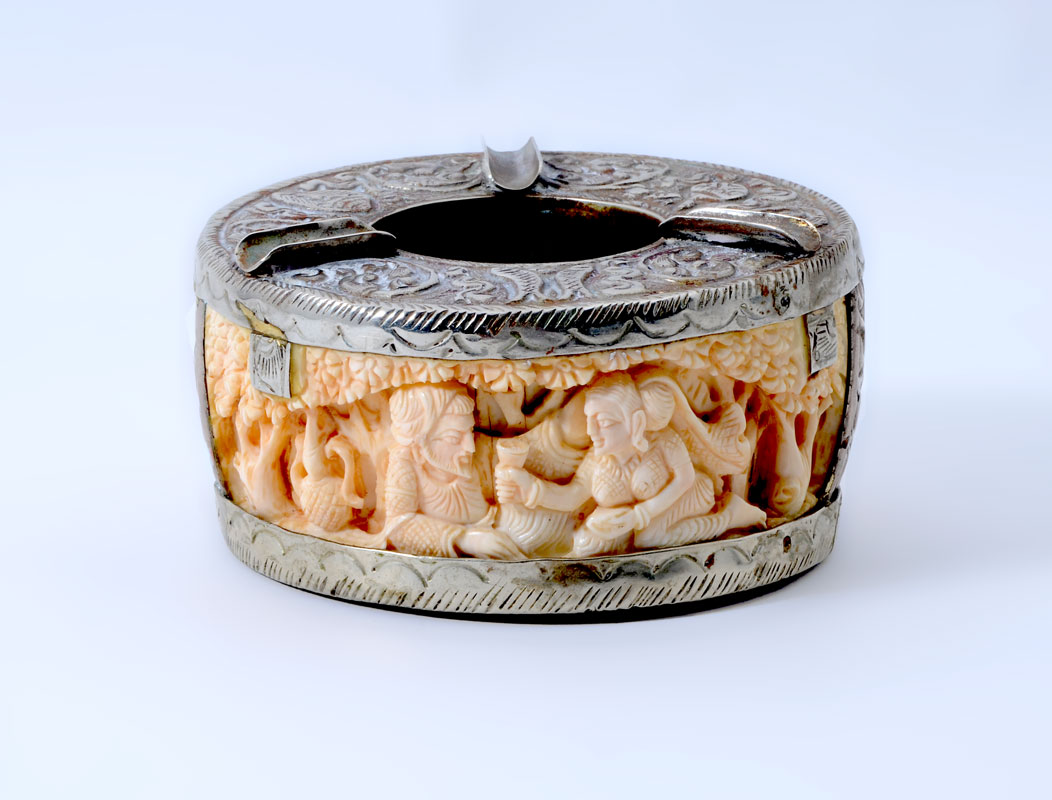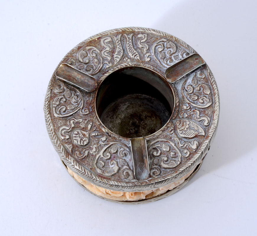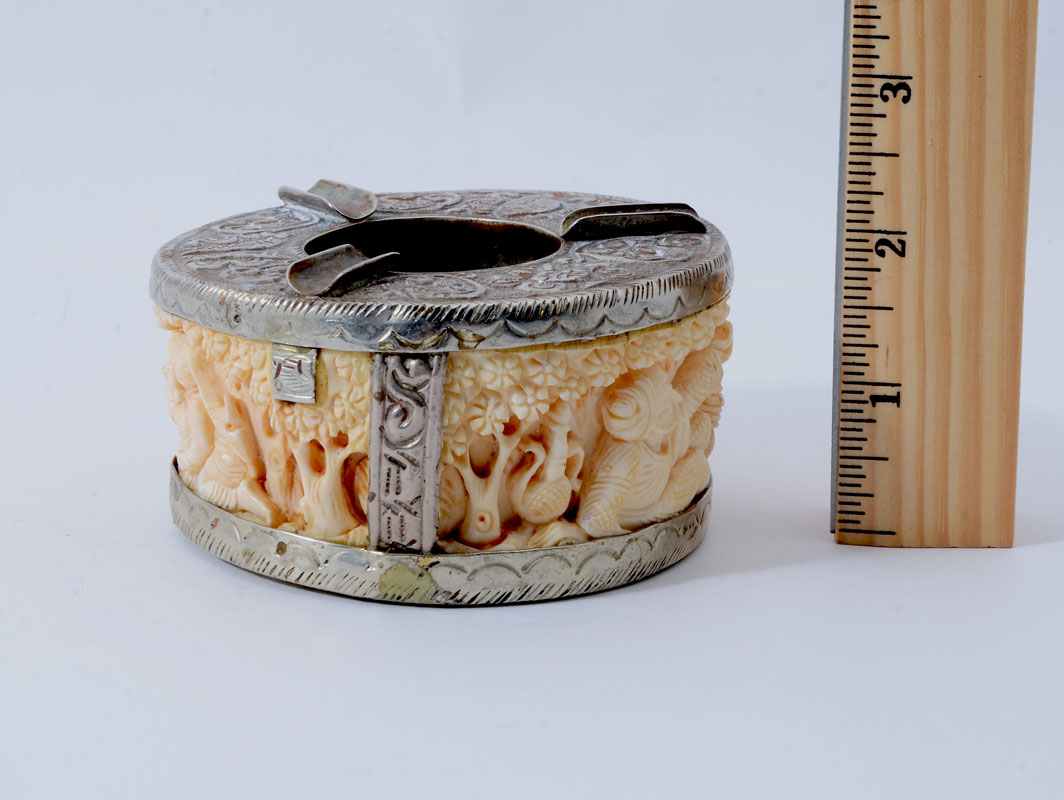 ANTIQUE CARVED IVORY ASHTRAY: Late 19th Century, carved ivory body with panels of man and woman reclining drinking wine, embossed silver toned metal top and bottom. Sold with a 2017 certificate of antique status. Measures 2'' h. x 3 3/4'' dia. Due to restrictions on Liveauctioneers, this lot is only available for online bidding on Invaluable.com