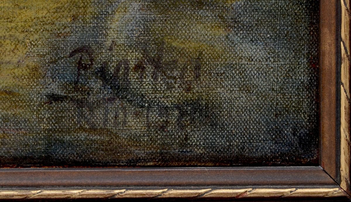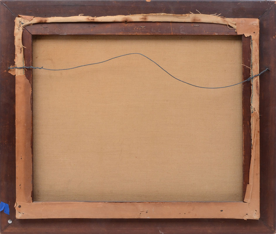 CONDITION: Restretched, some scattered craquelure and minor inpaint, frame shows some wear, sold as is.
