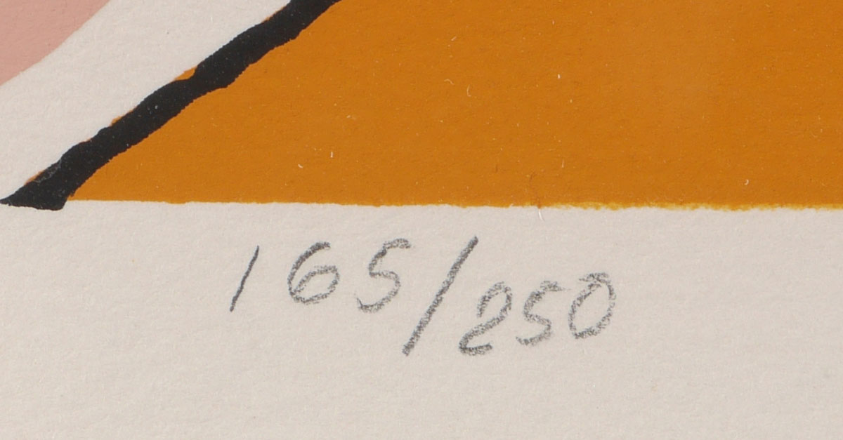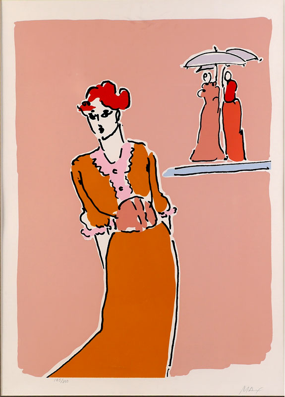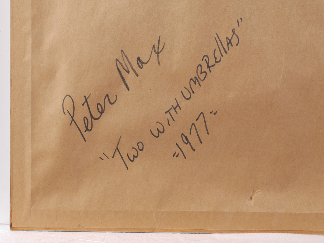 PETER MAX SERIGRAPH ''TWO WITH UMBRELLAS'': Sight size 29'' x 21.5'', pencil signed lower right, numbered 165/250 lower left, framed, 37.5'' x 29''.