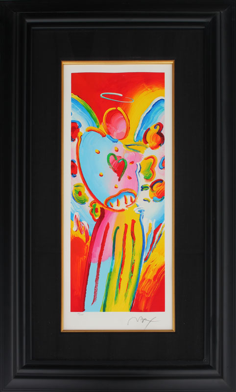 PETER MAX OFFSET LITHOGRAPH ''ANGEL WITH HEART'': Sight size 25'' x 10.5'', pencil signed lower right, numbered lower left 111/350, custom framing, 38'' x 23''.