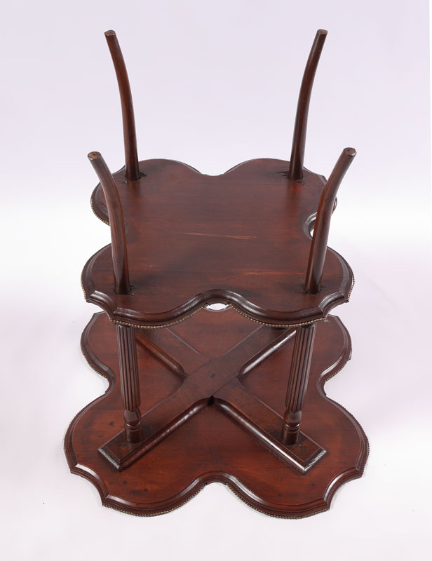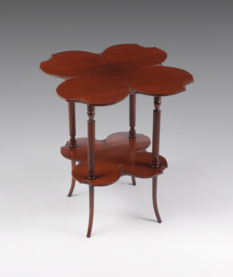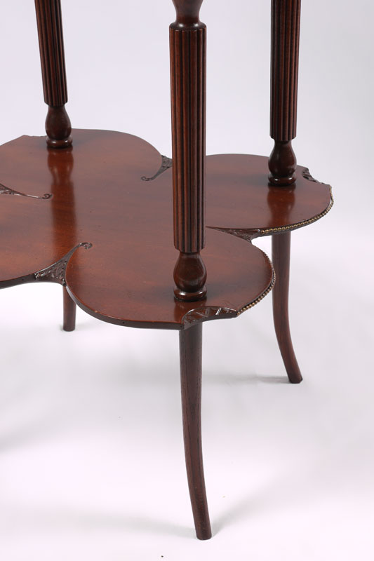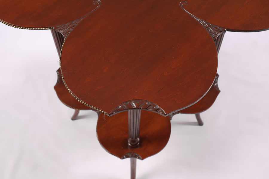 MAHOGANY CLOVER LEAF TWO TIER OCCASIONAL TABLE: Clover leaf shaped top & lower shelf with carved accents, applied brass bead borders, fluted supports, shaped legs. Overall measures 29'' h. x 24'' x 24''.