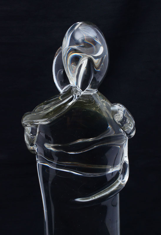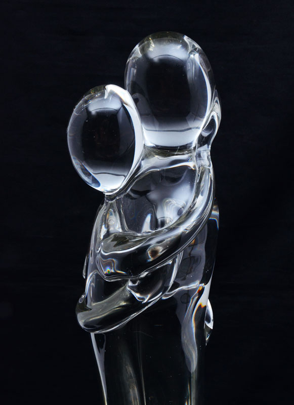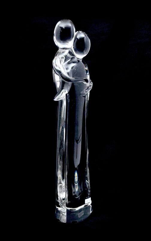 EROS RAFFAEL ITALIAN GLASS LOVERS SCULPTURE: Molded clear glass sculpture of 2 lovers, signed Eros Raffael, overall 22 1/2'' h. x 5 1/2''