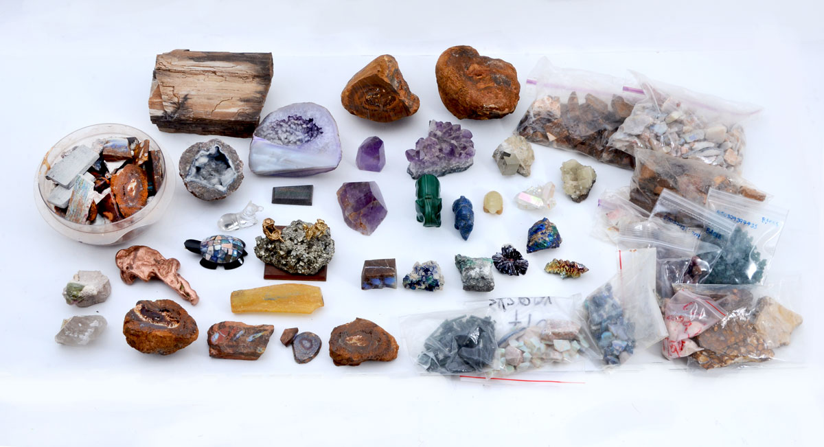 LARGE COLLECTION MINERAL, STONE, AND GEM SAMPLES: Rough natural opal, amethyst, petrified wood, quartz, rubies, and other unidentified mineral and stone samples. Sold with a polished figural malachite elephant, mosaic turtle, quartz horse, pyrite sample with figural miner and donkey.