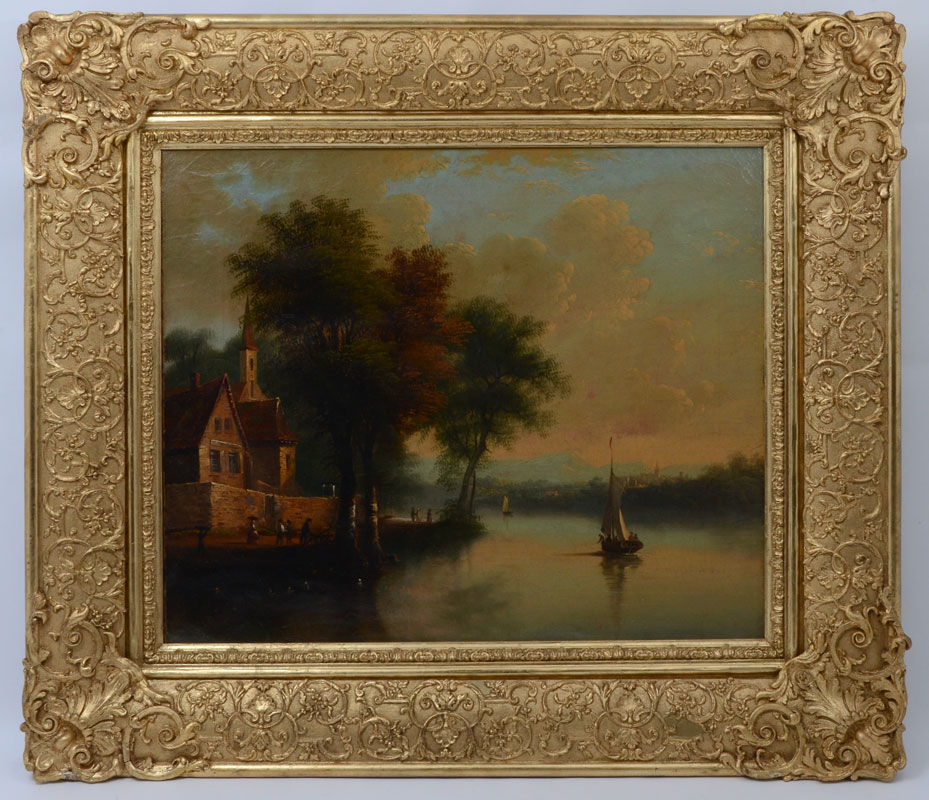19TH C. ENGLISH SCHOOL PAINTING: River Scene at Sunset with Figures, Boats and s Small Village, Oil/Canvas, 20'' x 23.5'', no visible signature, ornate gilded gesso frame, 30'' x 33.5'' x 3.5''.