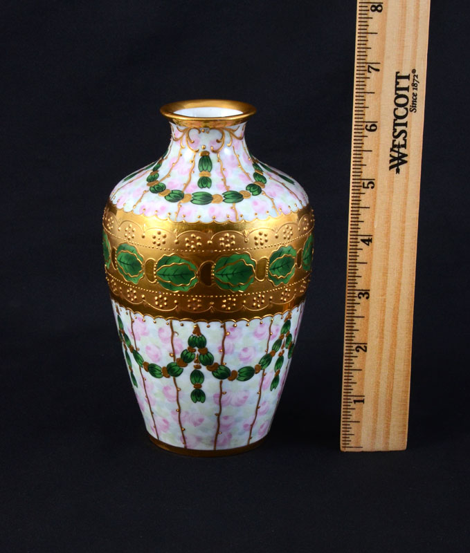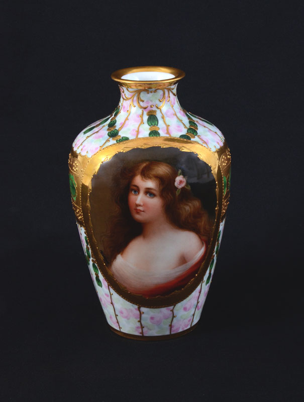 WAGNER SIGNED ROYAL VIENNA PORTRAIT VASE: Titled ''Lydia'' on base, portrait medallion of young maiden signed Wagner, additional floral and gilt decoration. Marked on base with blue beehive mark, ''Lydia, SER:564, Depose'', numbered on rim 5275 39A, 6'' h. x 3 3/4''.