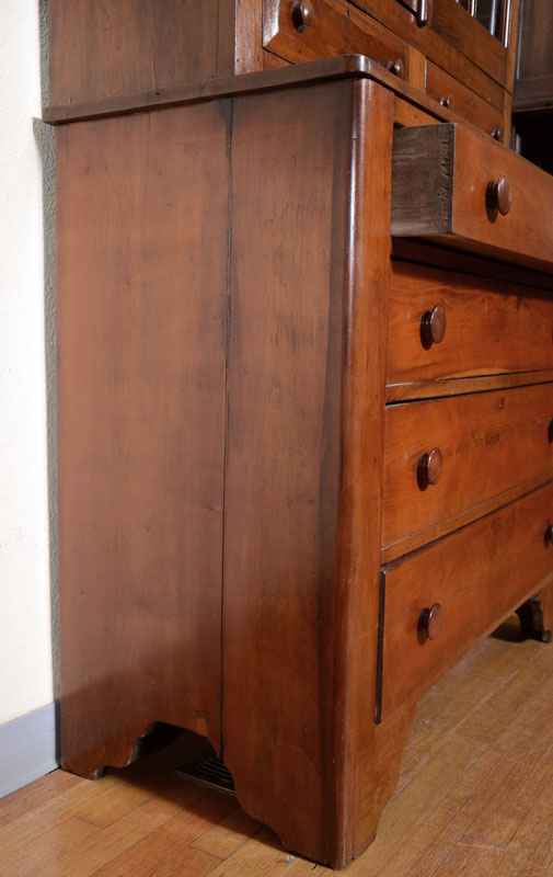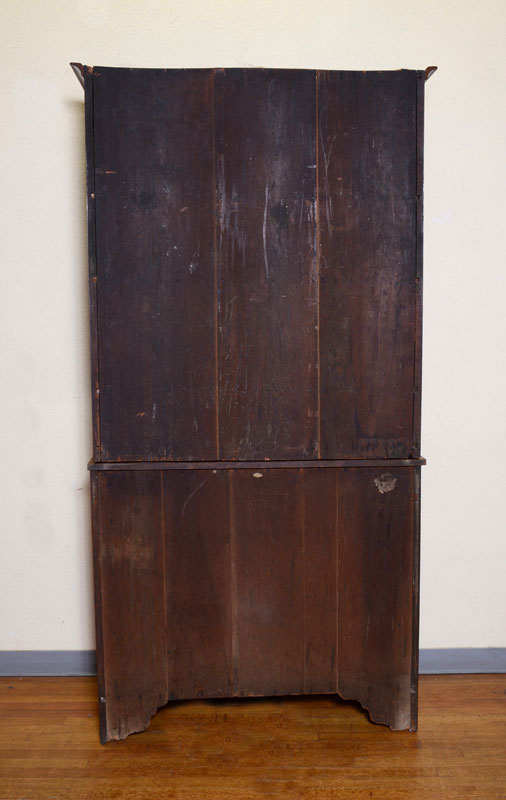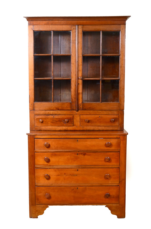 19TH CENTURY BOOKCASE ON CHEST: Top with 2 six light doors over 2 drawers, 2 internal shelves. Base with 4 graduated drawers, wood pulls, shaped skirt. Overall measures 86 1/2'' h. x 43 1/4'' x 19 1/4''.