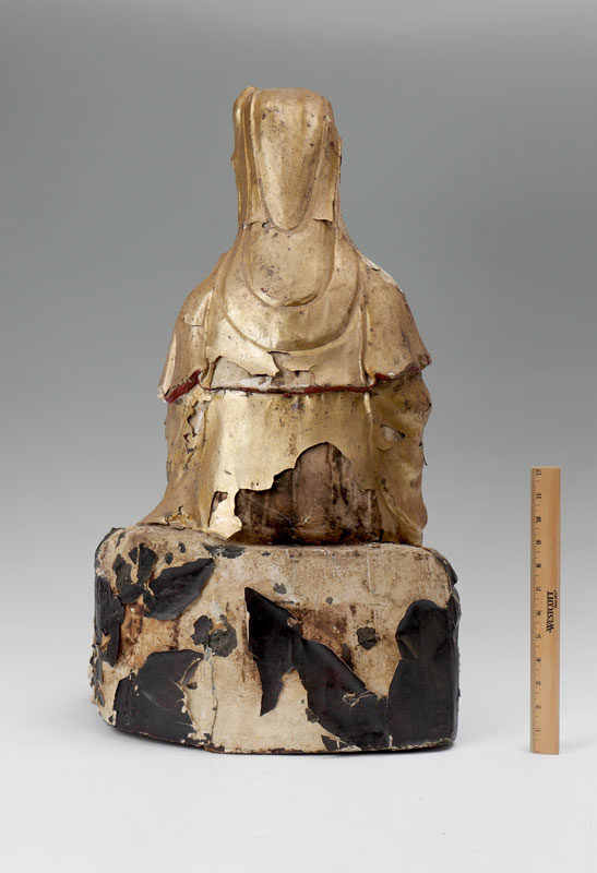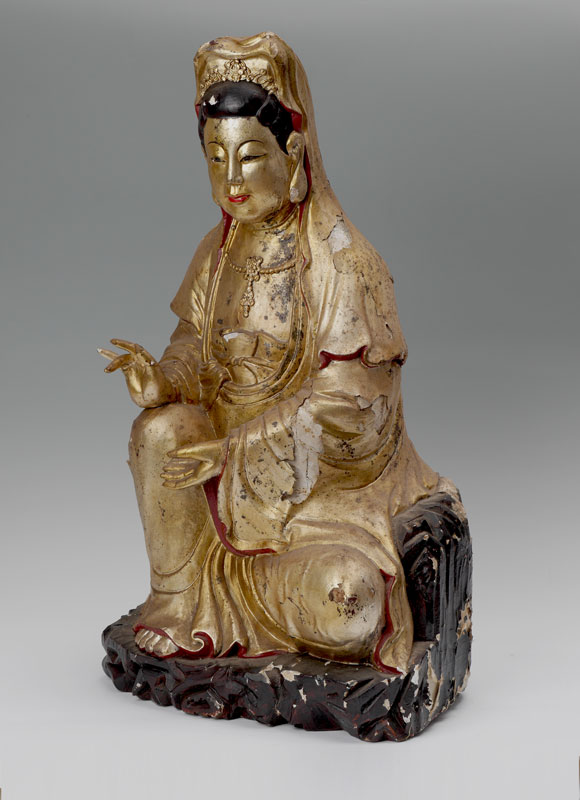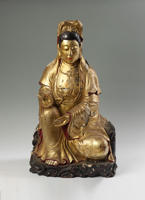 CHINESE CARVED GILT DECORATED GUANYIN: Antique figure of seated Guanyin (Quanyin, Guan yin), decorated with gold gilt, black, and red paint, overall measures 28'' h. x 17'' x 12''.
