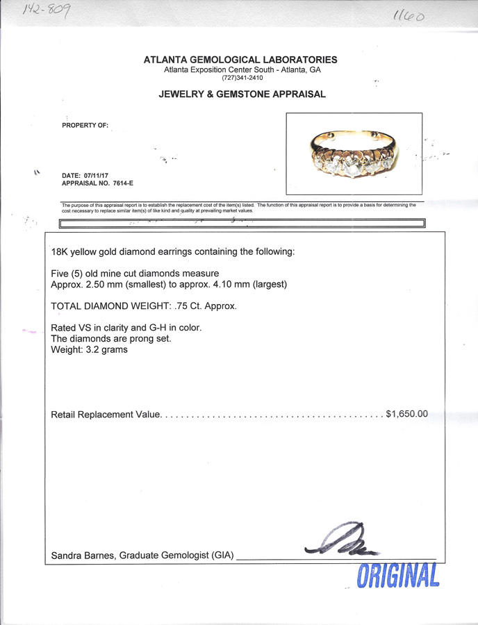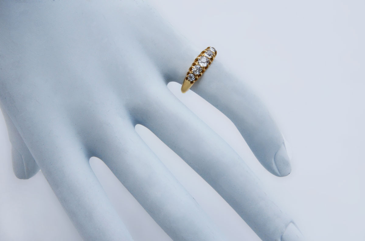 18K VICTORIAN PERIOD DIAMOND WEDDING BAND: 5 old mine diamonds are featured in this period correct yellow gold ring. Size 3 with sizing bumps. Total weight 3.1 grams.