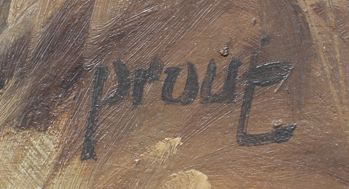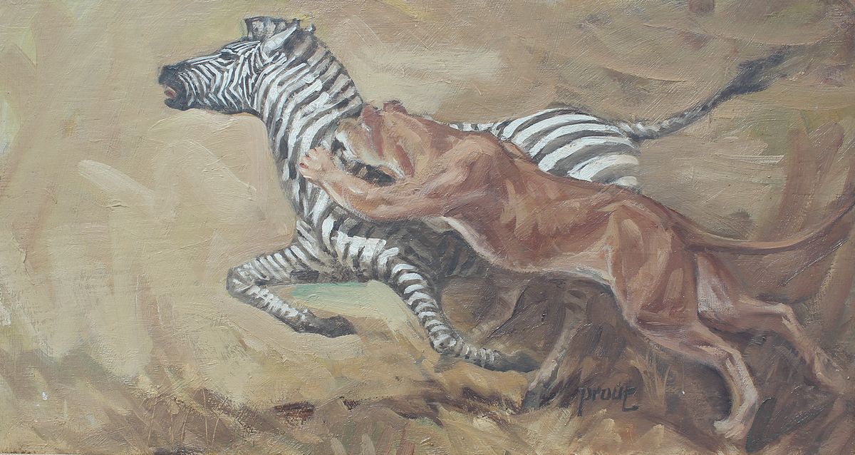 PROUT, George, (American, 1915-2016): Lion Taking Down Zebra, Oil/Board, 10'' x 18'', signed lower right, framed, 13'' x 21''. From the George Prout Estate Collection.