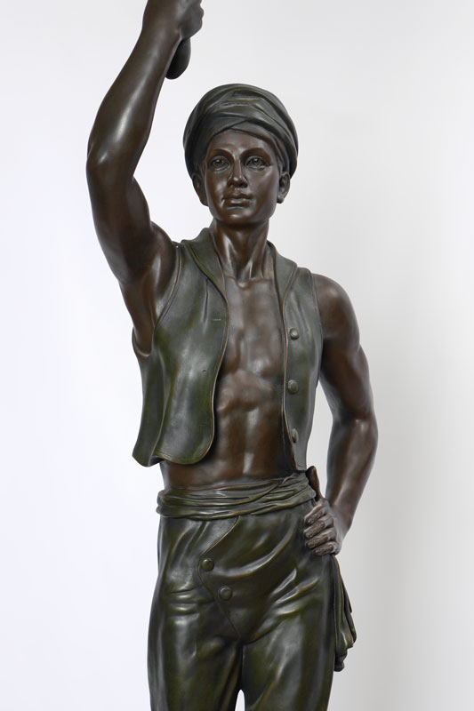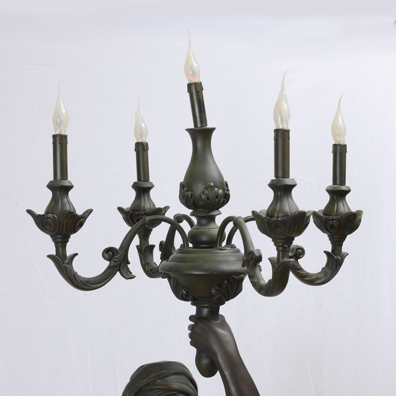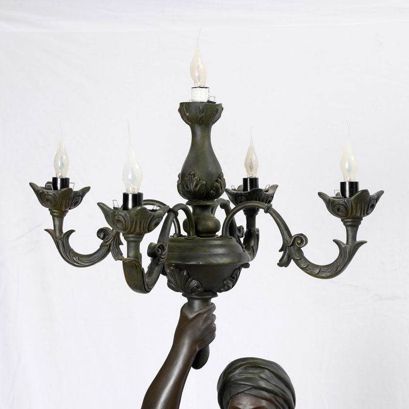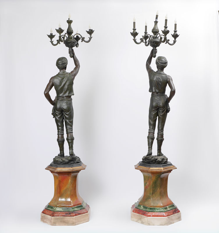 PAIR BLACKAMOOR TORCHIERE FLOOR LAMPS: 20th Century composite construction molded figural blackamoor men holding 5 light fixtures, approx. 63'' h. x 23'' dia. Sold with molded composite octagonal polychrome bases, 23 1/2'' h. x 21''.