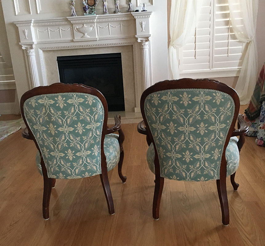 PAIR OF FRENCH FAUTEUIL OPEN ARM CHAIRS: Floral carved top rail, shaped arms, skirt, front legs. Green patterned upholstery, overall measure36'' h. x 26'' x 26 1/2''.