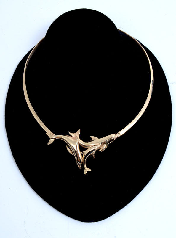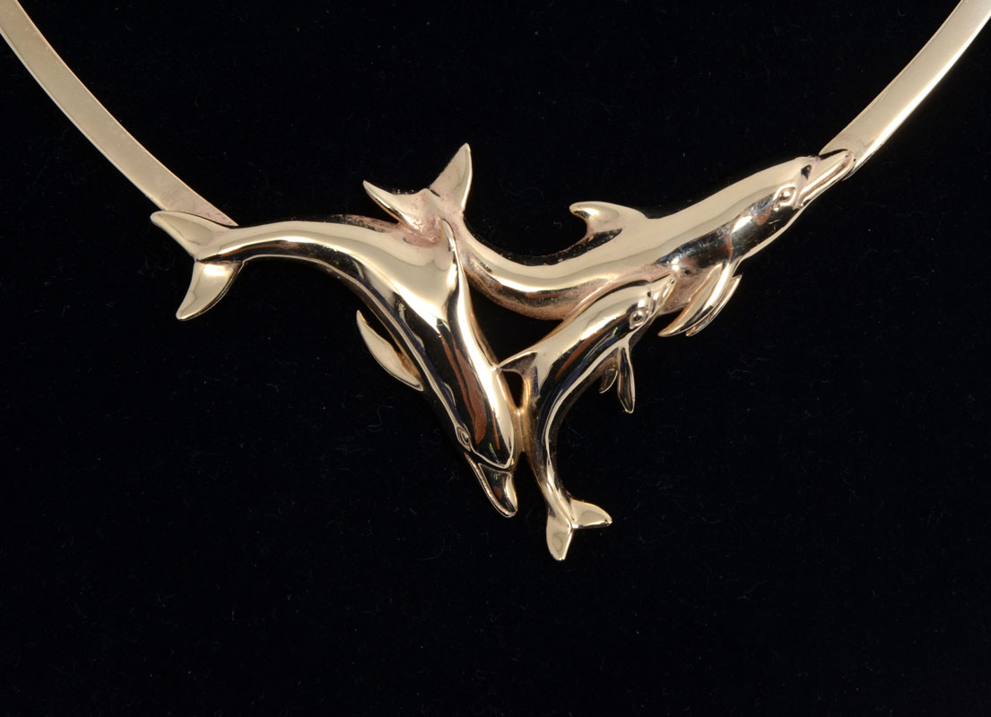 14K DOLPHIN NECKLACE ''GO DOLPHINS'': 14K yellow gold 3-D dolphin design on Flat rigid necklace. Length: 16'' 14K 36.4 grams.