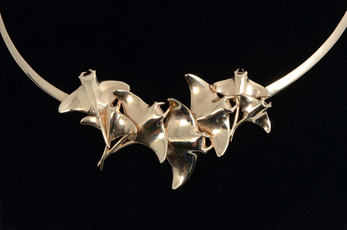 14K MANTA RAY MOTIF LADIES NECKLACE ''GO RAYS'': 14K yellow gold stingray design on flat rigid necklace. 7 graceful manta rays of varying sizes adorn this necklace Length: 16'' Weight: 14.5 grams.