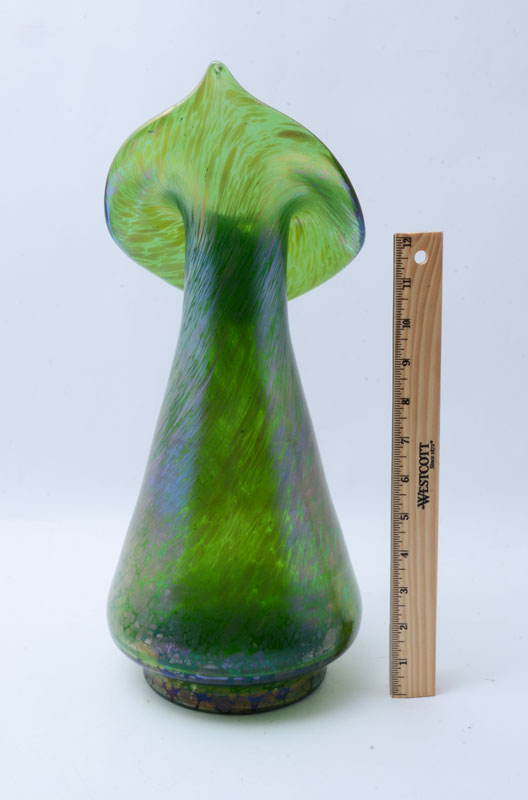 ATTRIB. LOETZ CRETA PAPILLION LARGE VASE: Attributed to Loetz or possibly Kralik, large vase with jack in the pulpit style rim, flared body, footed base with ground pontil, no markings. Overall measures 16 1/4'' h. 7''.