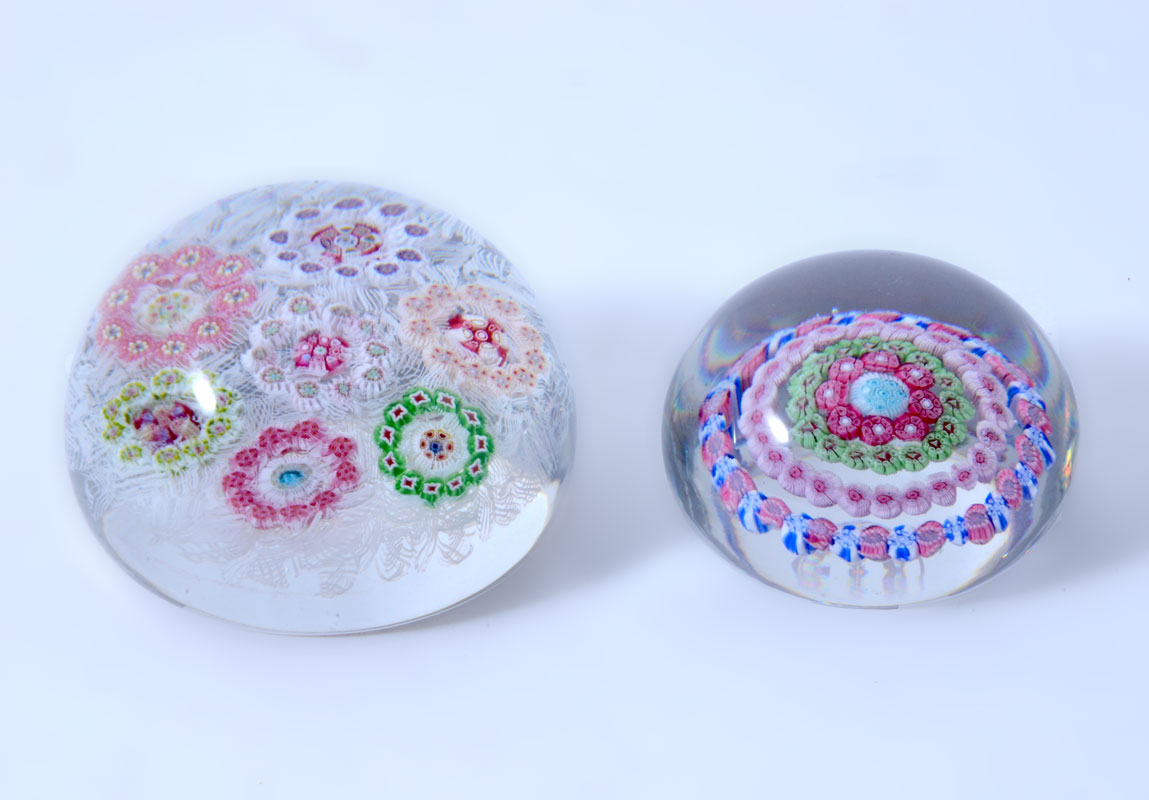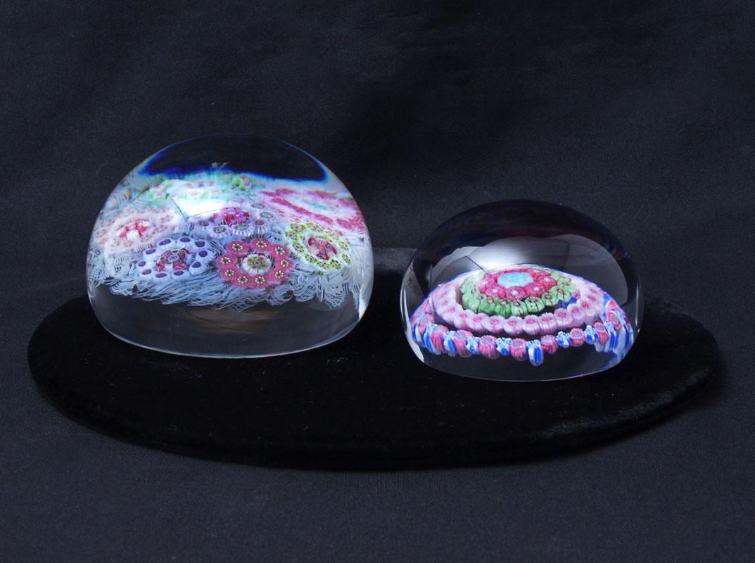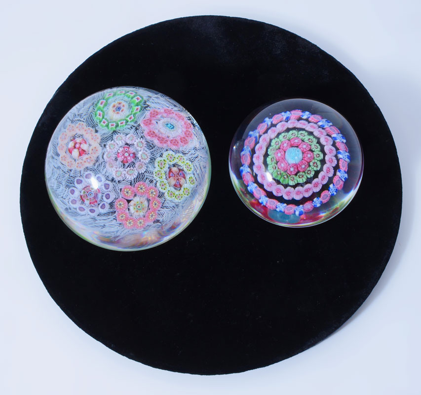 2 BACCARAT MILLEFIORI PAPERWEIGHTS: Each marked on base with Baccarat France mark, larger 2'' h. x 3'' dia., smaller 1 1/2'' 2 3/8'' dia.