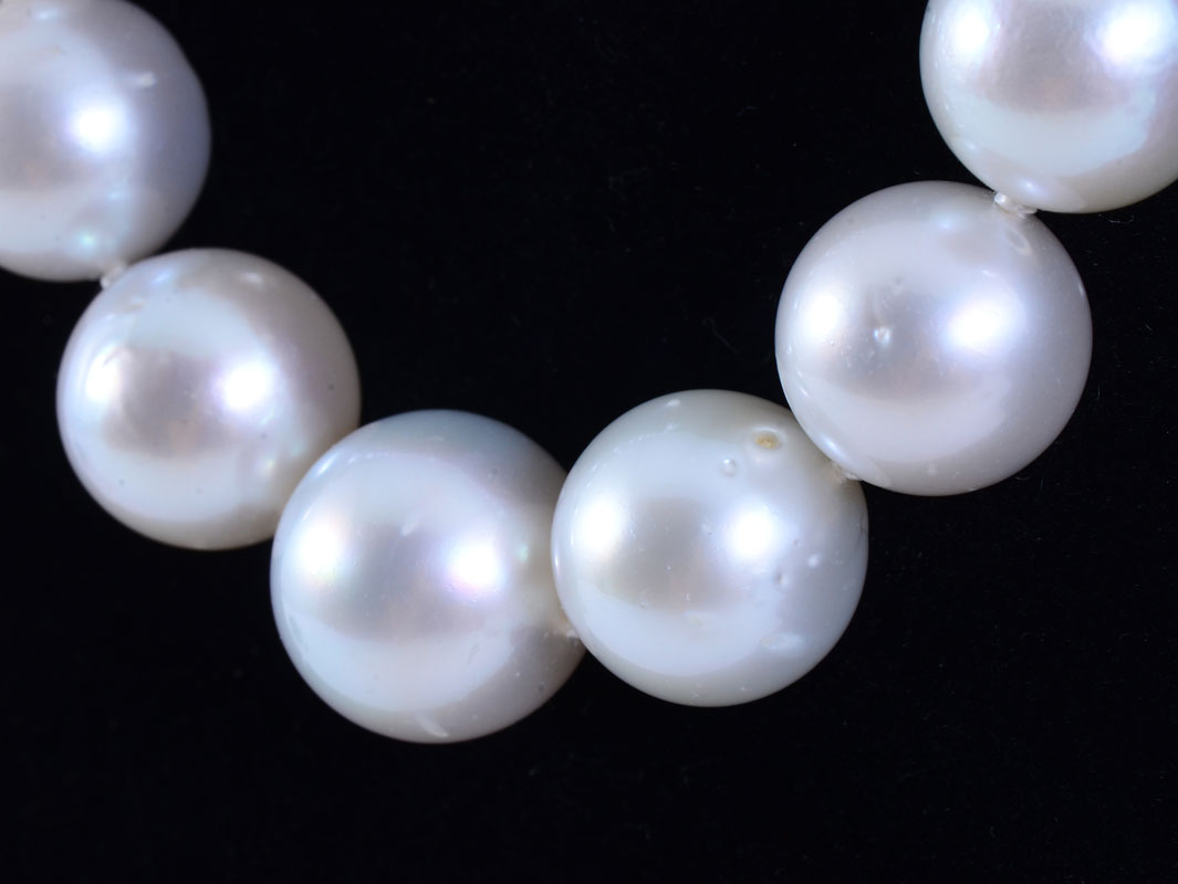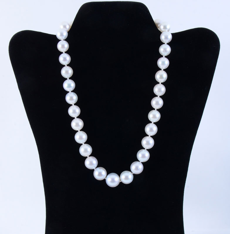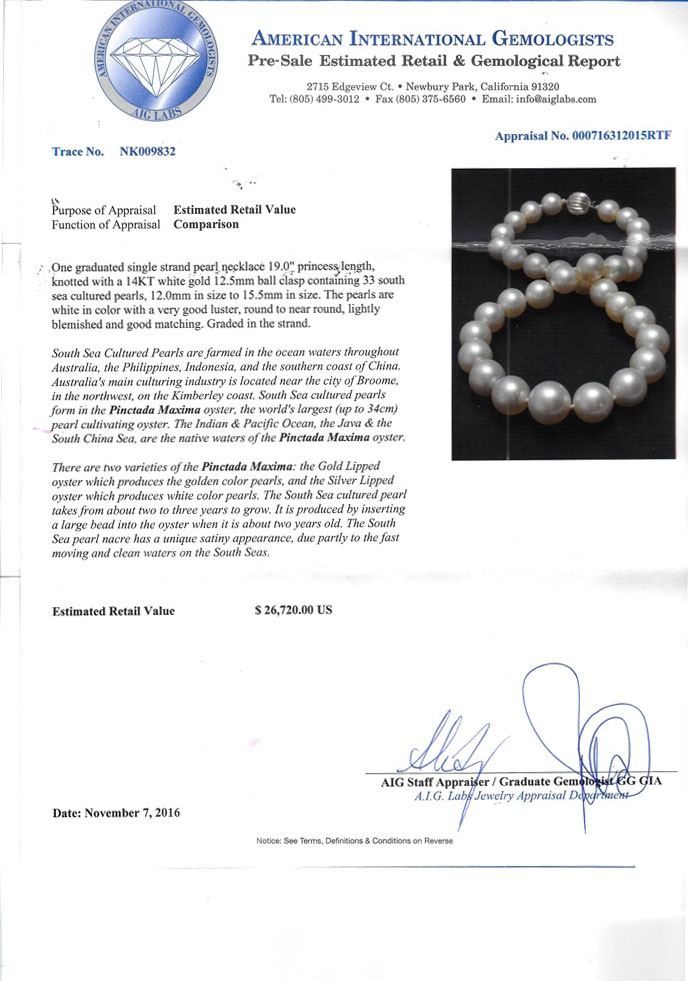SOUTH SEA CULTURED PEARL NECKLACE: 19'' graduated single strand of 33 south sea cultured pearls graduating from 12,0mm to 15.5mm. White in color with good luster, good matching and lightly blemished. Sold with AIGL appraisal which reflects $26,720 as their opinion of replacement value for this necklace.
