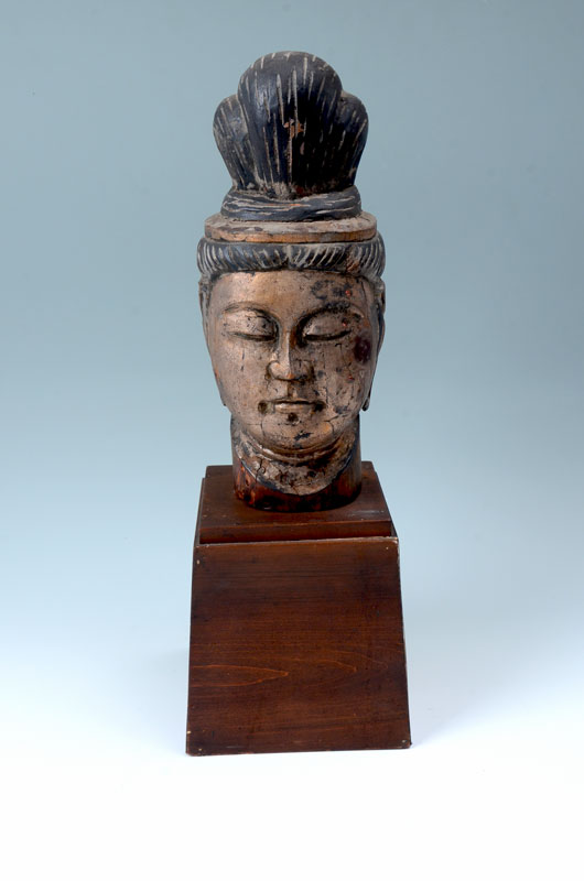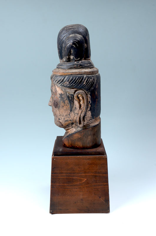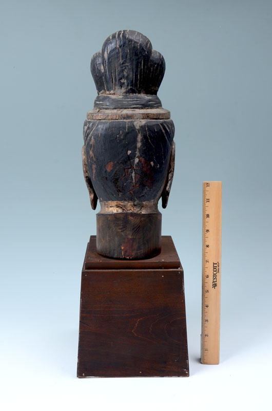 CARVED GILT WOOD BUDDHA BUST: Southeast Asian carved bust of Buddha with gilt and black paint decoration, affixed to wood base 21 1/4'' h. x 7 1/4'' x 7 1/4''.
