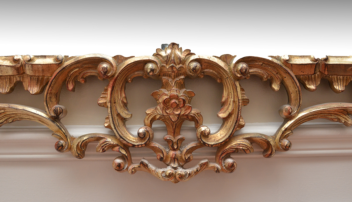 ROCOCO STYLE GOLD DECORATED WALL MIRROR: Open work composite frame with antiques gold decorated foliate scroll and flower blossom designs. 62 1/2'' h. x 38 1/2'' x 1 1/2''.