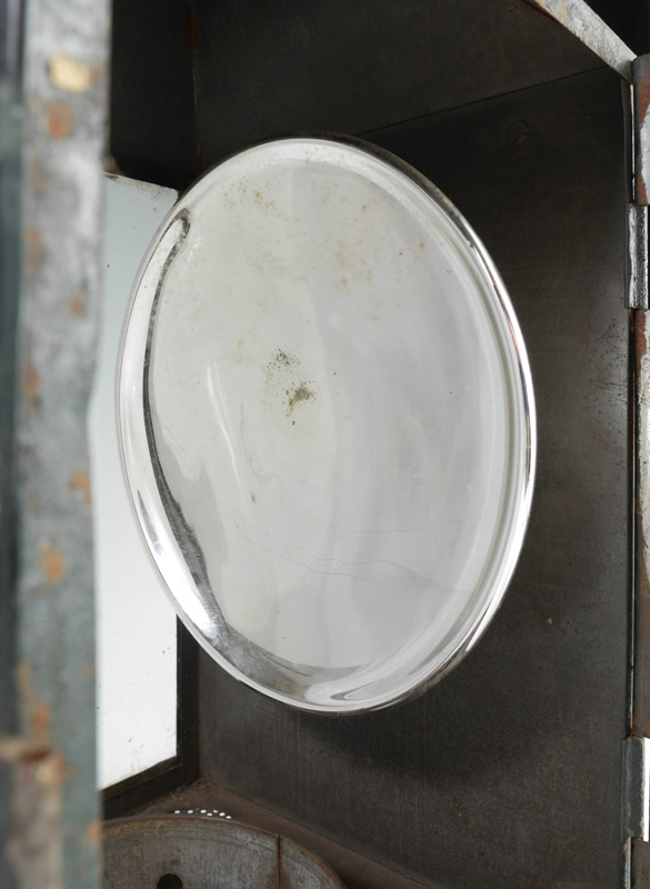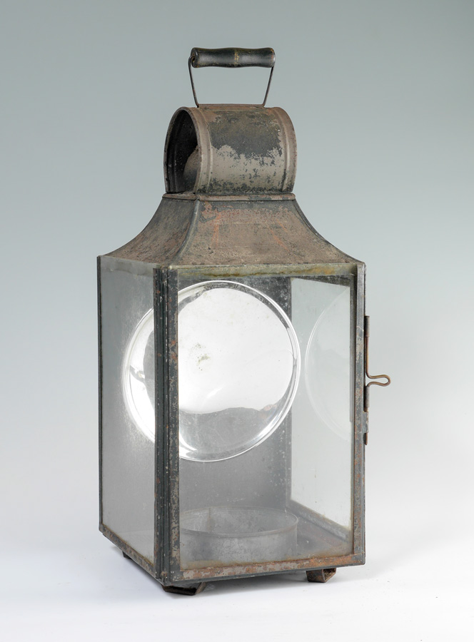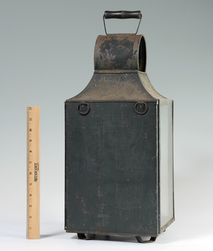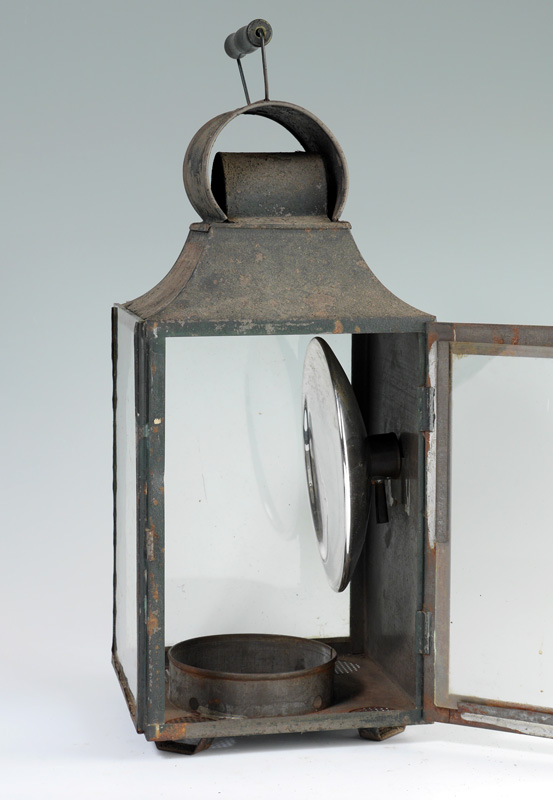 LARGE TIN LANTERN WITH MERCURY GLASS REFLECTOR: Large tin frame with remnants of original paint, handle applied to arched vent, glass sides and front, hinged side door, 4 feet. Measures 19 1/2'' h. x 9'' h. x 9''.