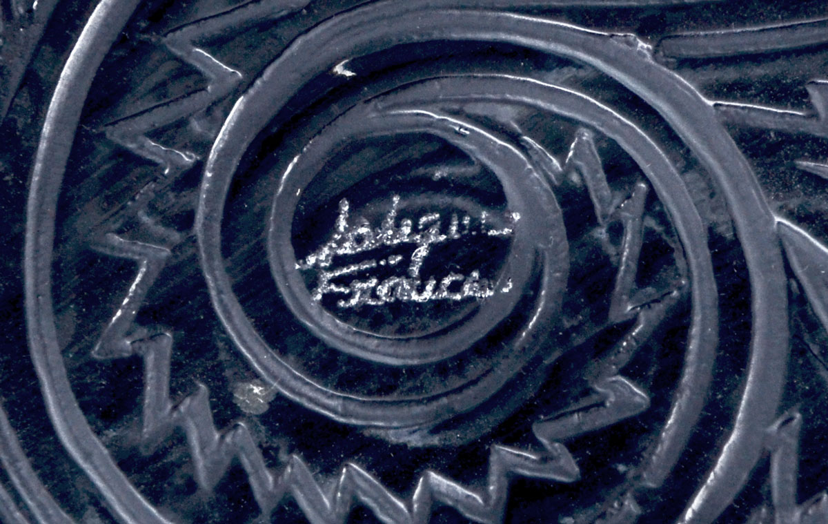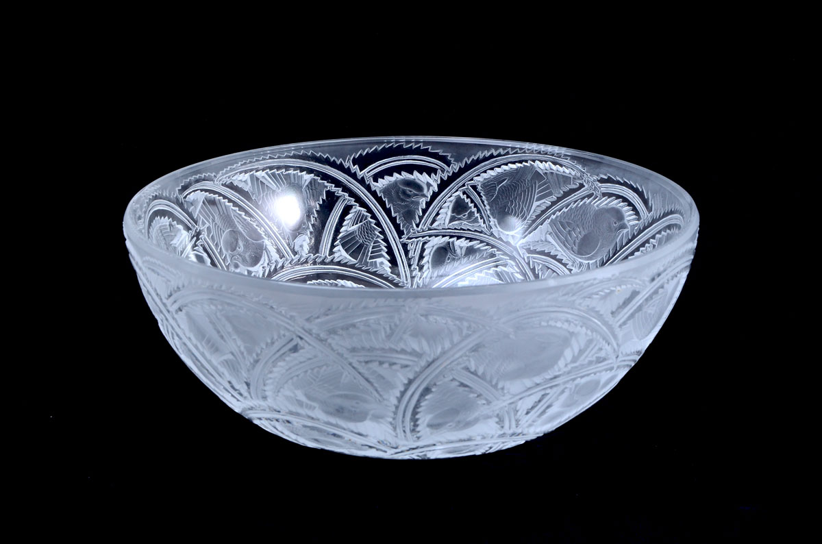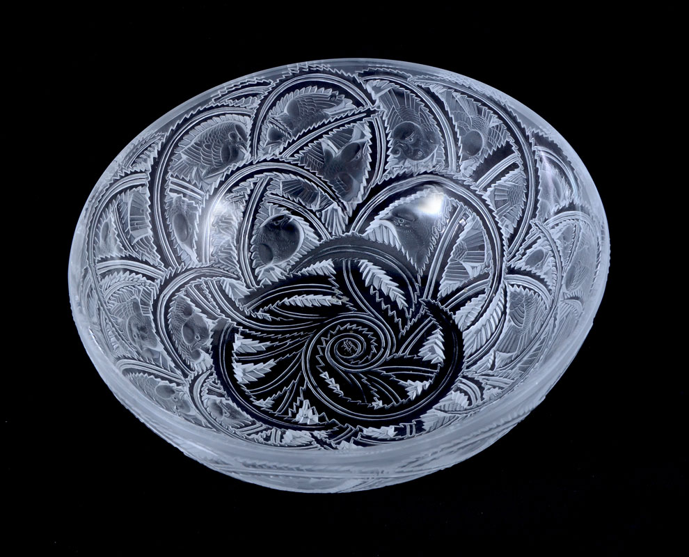 LALIQUE PINSONS CRYSTAL CENTER BOWL: Molded birds and foliate motifs, signed Lalique France center of base, overall measures 3 1/2'' h. x 9 1/4''. Sold with a wood stand, 2'' h. x 6'' x 6''.