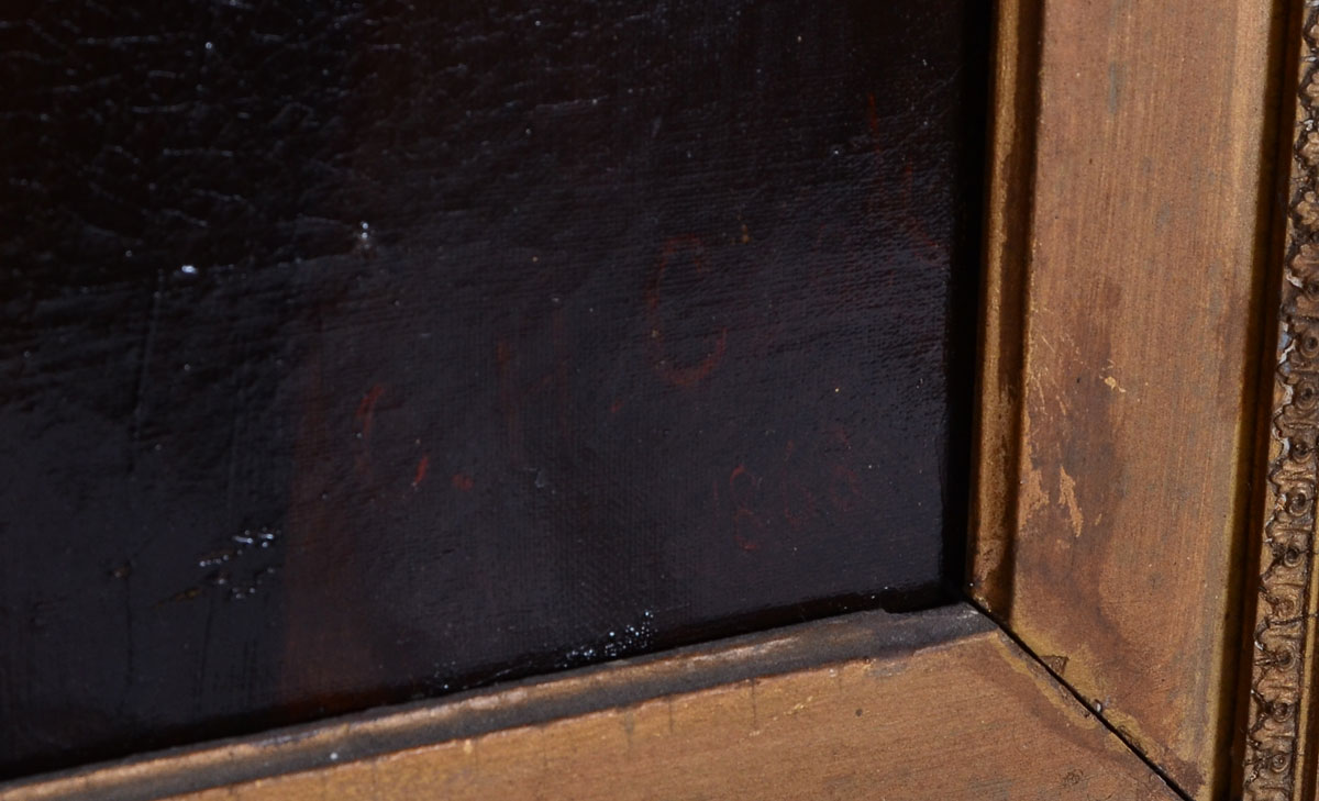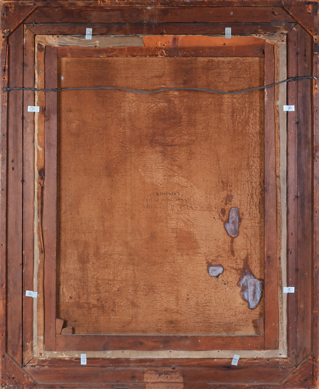 CONDITION: Needs cleaning, sporadic craquelure, several flecks, several patches verso, touches of inpaint, frame has wear, sold as is.