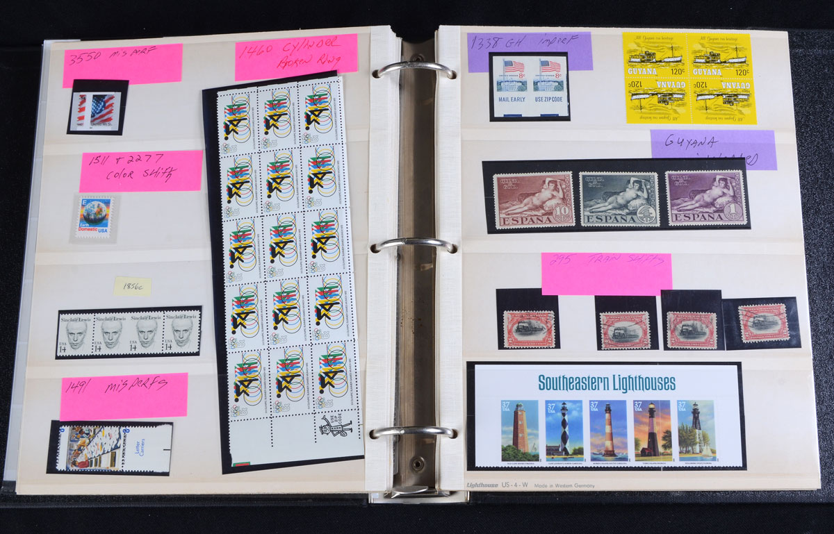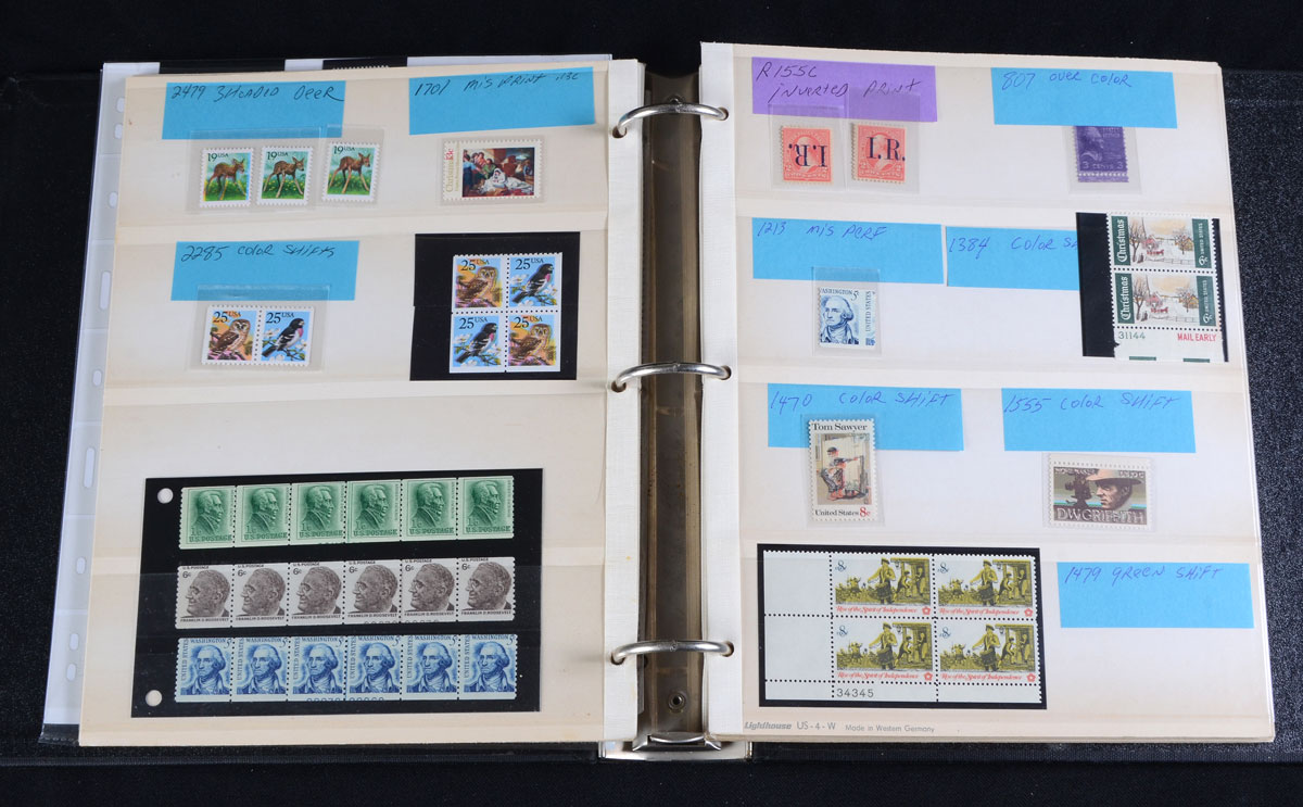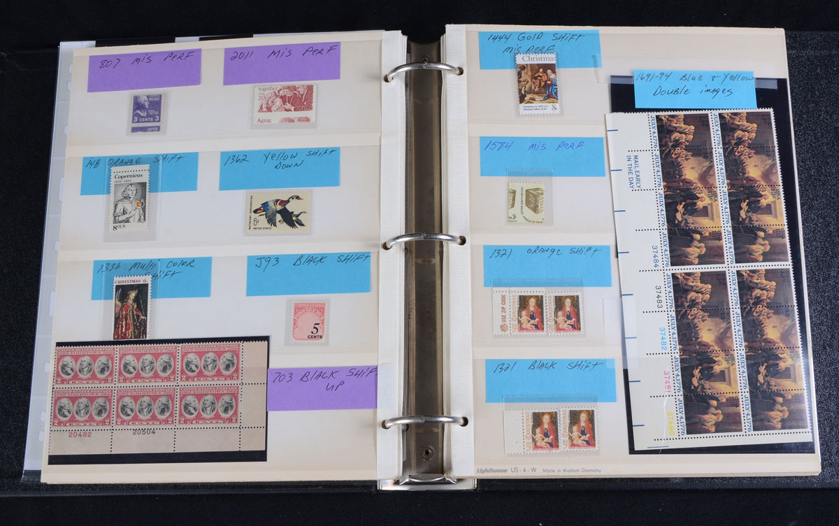 LARGE COLLECTION OF ERROR STAMPS IN BINDER: An assembled collection of primarily US stamps with assorted errors to include color shifts, mis-perforation, lines, double printed and more. All US stamps identified with Scotts number and error. Several pages of foreign errors stamps included.