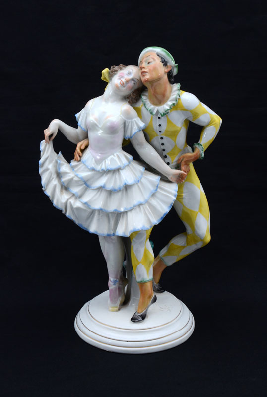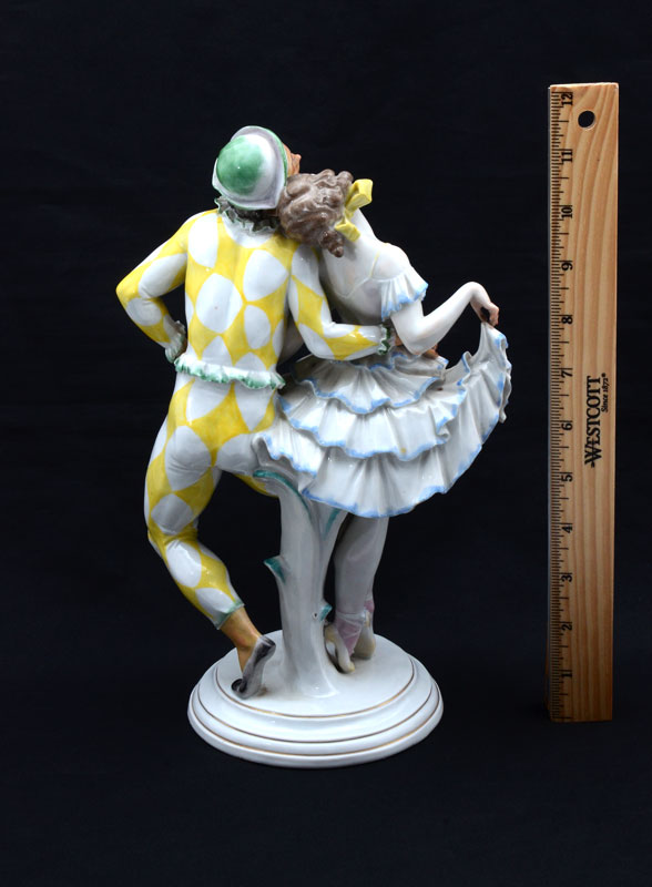 VOLKSTEDT PORCELAIN FIGURAL HARLEQUIN DANCERS: Figural group of 2 dancer, harlequin dressed man and woman holding dress out. Incised mark top of base, blue Volkstedt mark under. Overall measures 11 1/2'' h. x 7 1/2''.