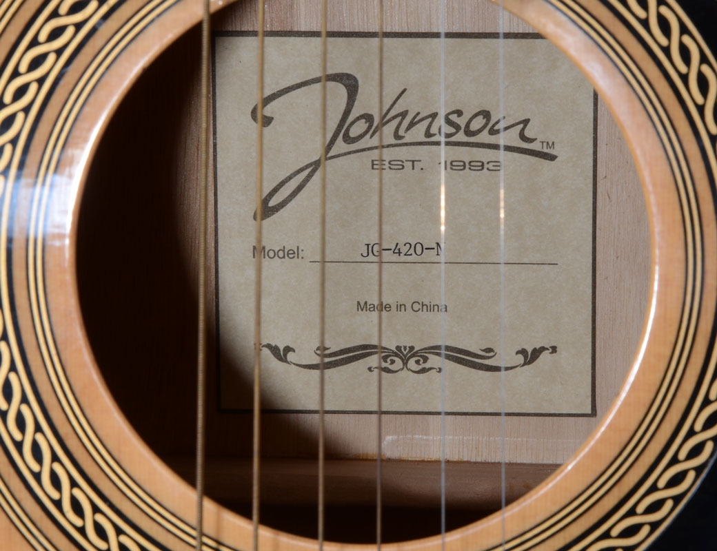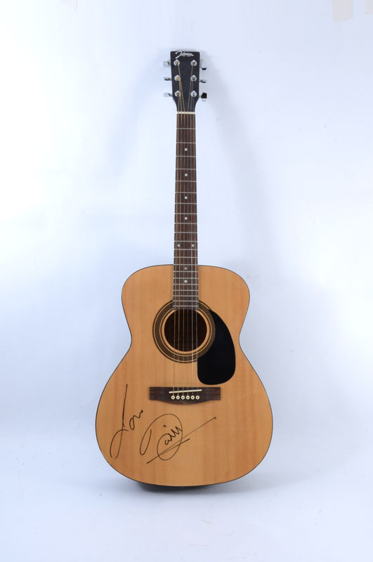 BARRY GIBB SIGNED ACOUSTIC GUITAR: Johnson model JG-420-N acoustic guitar signed by Barry Gibb, one of the members of the disco super group The Bee-Gees. Overall measures 39 1/2'' l. x 15 1/2'' x 4''.