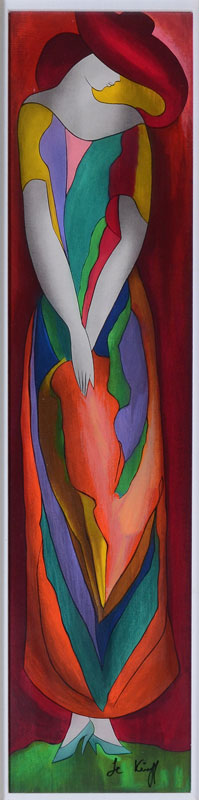 LINDA LE KINFF MIXED MEDIA ON CANVAS FULL LENGTH WOMAN WEARING HAT: Embellished Serigraph on Canvas, 38'' x 9'', signed lower right, heavy gesso frame, 47.5'' x 19'', marked verso on canvas 62/250.