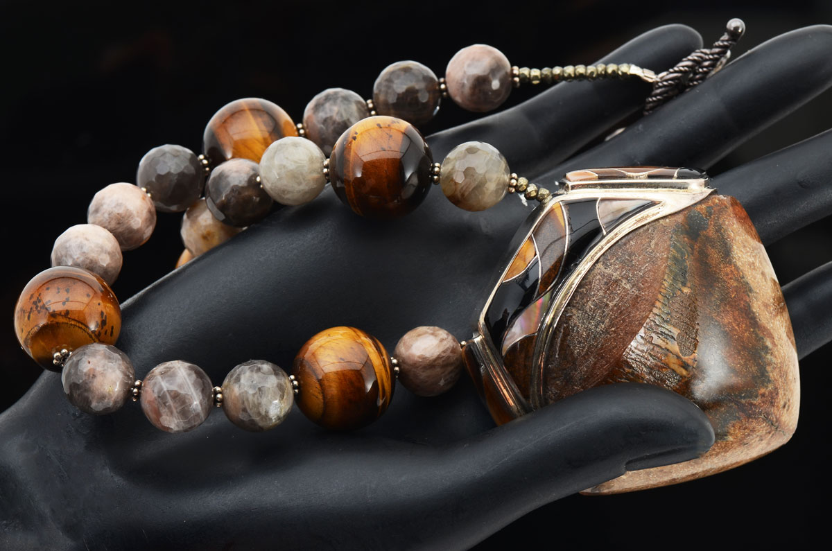MEGALODON TOOTH PENDANT CAPPED IN STERLING ON TIGER EYE & QUARTZ NECKLACE: 18'' necklace has alternating pattern of 18mm tiger eye and 12.2mm faceted grey quartz beads. Tooth with cap measures 2.5'' x 2.75''.