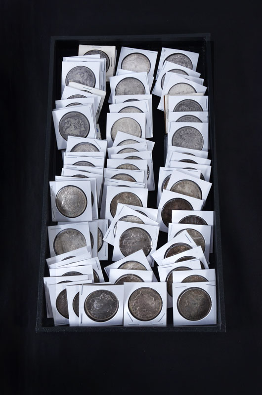 COLLECTION OF 73 US SILVER MORGAN DOLLARS: All ungraded, to include 1 1879, 1 1879-S, 1 1881, 1 1881-S, 3 1882-O, 2 1883, 1 1883-S, 1 1884-O, 1 1885, 1 1885-O, 1 1887, 1 1887-O, 4 1889, 3 1889-O, 1 1891-O, 1 1896, 2 1898, 2 1900, 2 1900-O, 1 1902, 1 1904-O, 21 1921, 13 1921-D, 7 1921-S.
