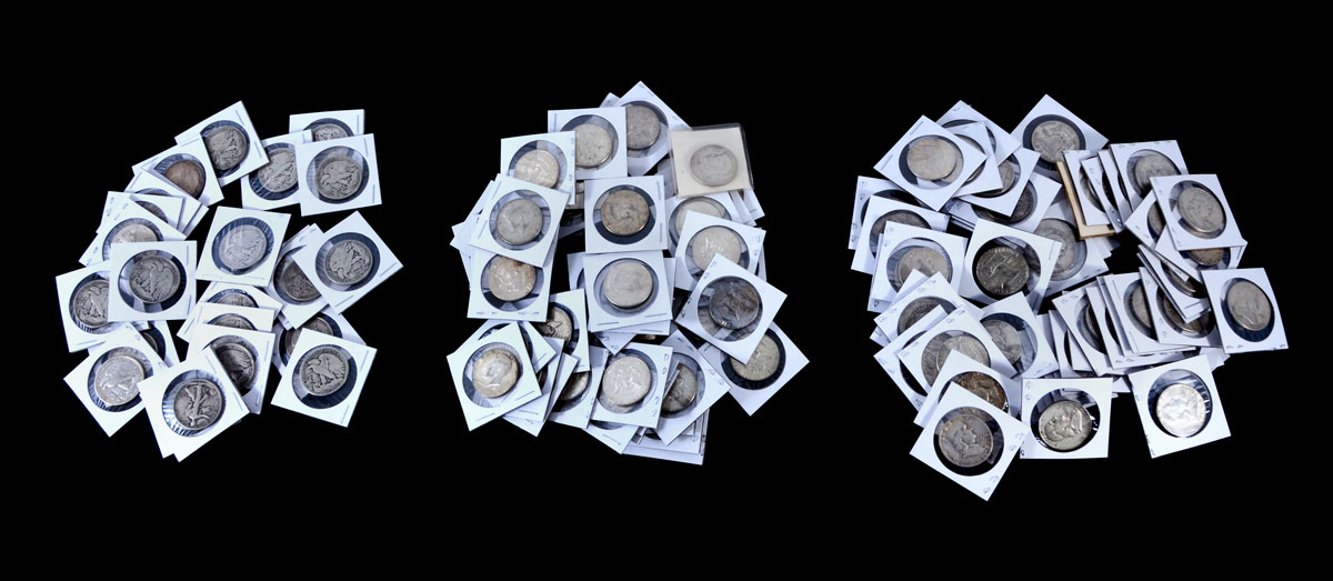124 US SILVER HALF DOLLAR COIN COLLECTION: All ungraded, approx. 124 coins total, assorted dated and mint marks to include a 1908 Barber, 23 Walking Liberty, 53 Benjamin Franklin, 47 1964 Kennedy.