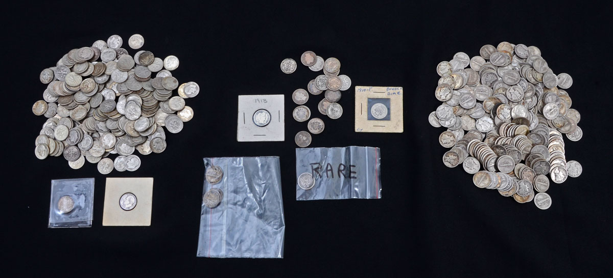560 US SILVER DIMES COIN COLLECTION: All ungraded, approx. 560 silver dimes, assorted dates and mint marks to include 2 Liberty Seated, 2 Barber, 306 Mercury, 240 Roosevelt.