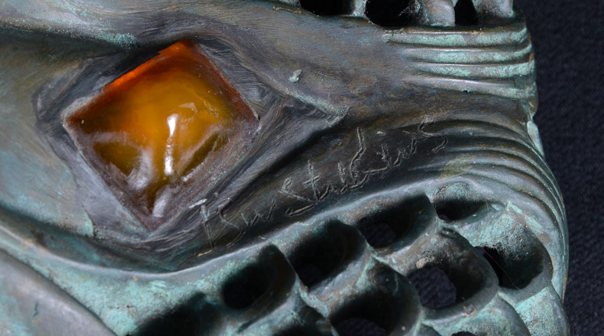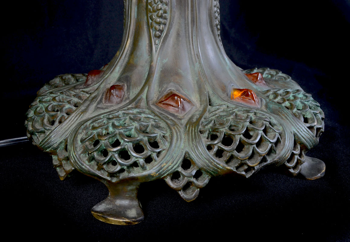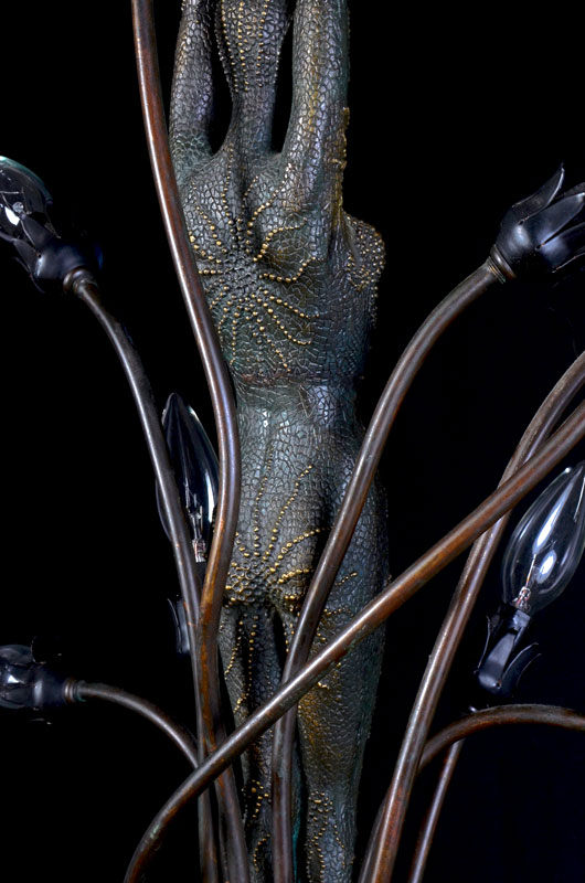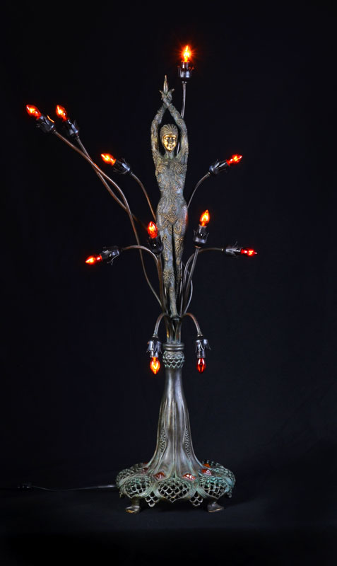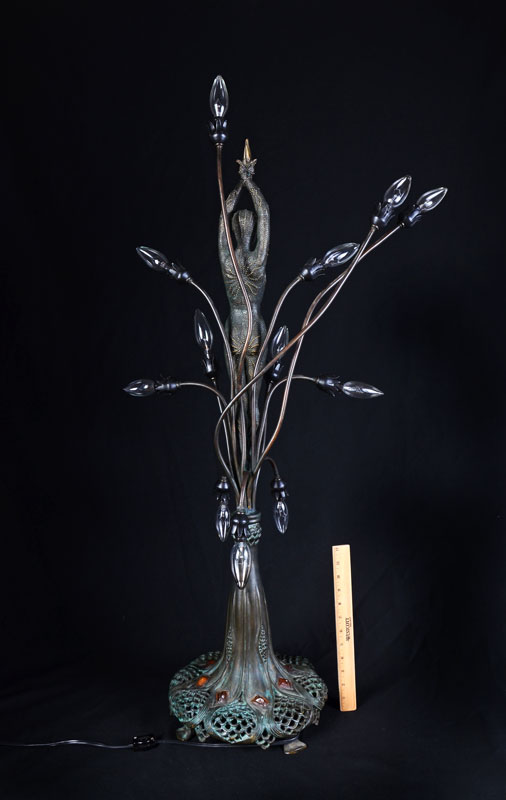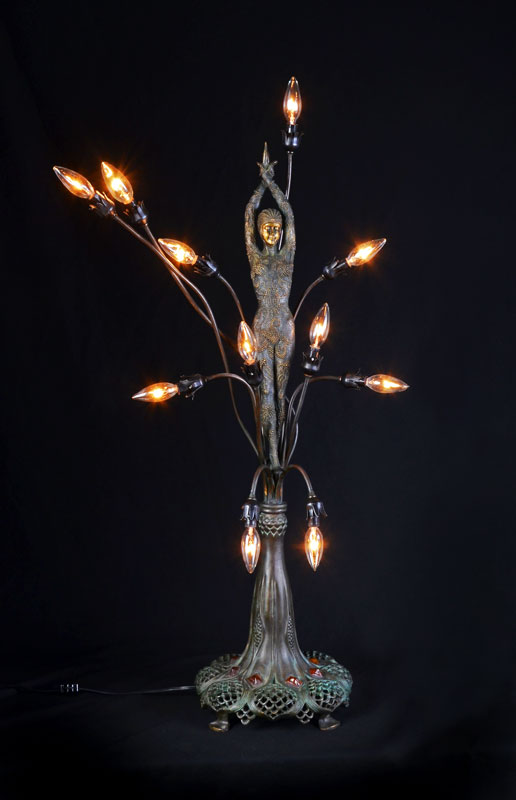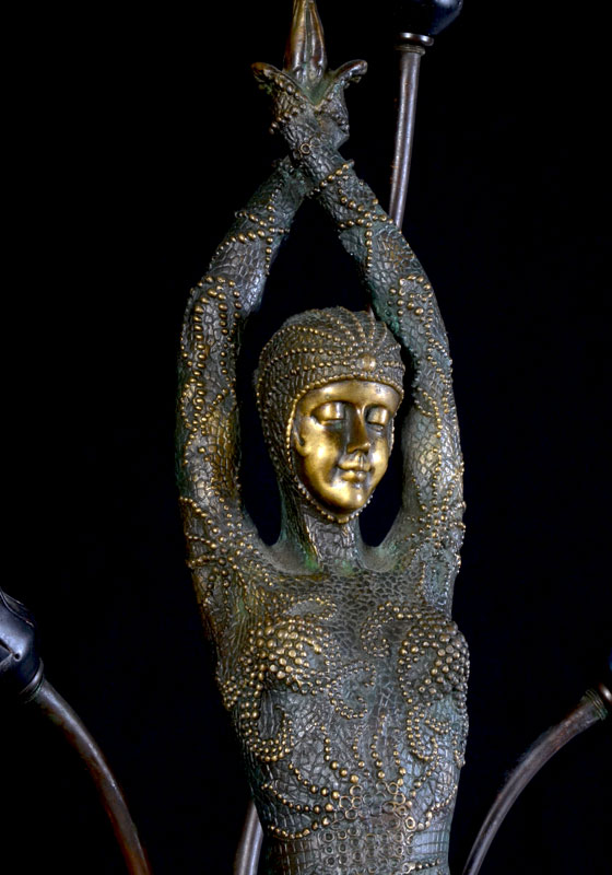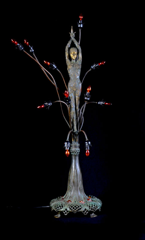 JSW STUDIOS BRONZE FIGURAL DECO WOMAN LAMP: Figural patinated bronze woman in the Chiparus style with hands raised, 10 lights on stylized branches with floriform bobeche. Signed on openwork ''jeweled'' base JSW Studios. Measures 41 1/4'' h. x 17''.