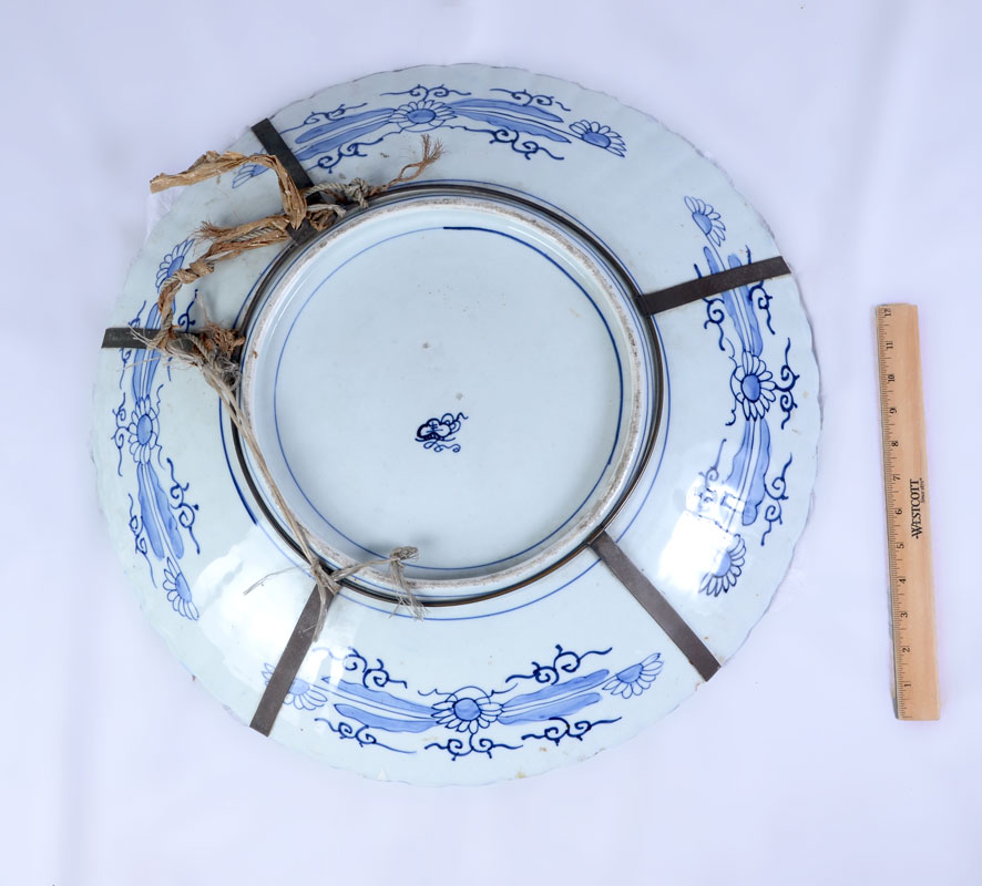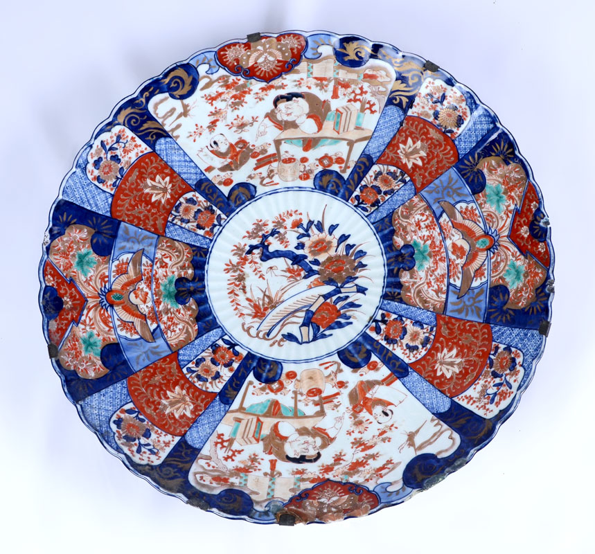 LARGE JAPANESE IMARI CHARGER: Scalloped rim and body, typical Imari polychrome decoration with genre scenes in reserves, unknown signature on base, 3 1/2'' h. x 22 1/2'' dia.