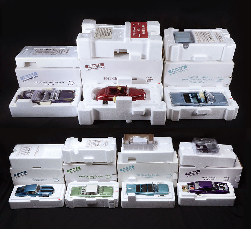 7 DANBURY MINT SCALE MODEL CHEVROLET CARS: Assembled collection of 7 Chevrolet / Chevy model cars, all in original boxes and packaging to include 1968 Chevelle Pro Street purple, 1959 Impala Convertible blue, 1967 Camaro Z/28 Sport Coupe blue, 1960 Impala Lowrider green, limited 1960 Impala Convertible blue, 1958 Impala Lowrider purple, 1941 Custom Rod candy apple red. All appear to be complete, no paperwork or COAs.