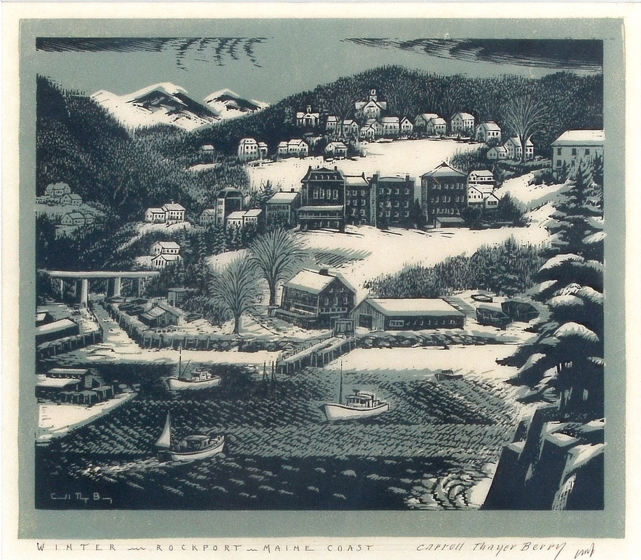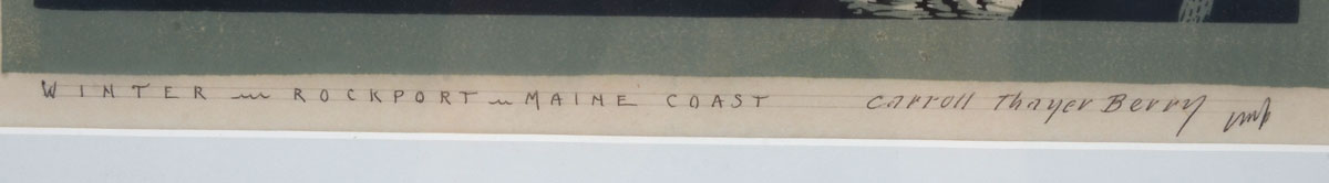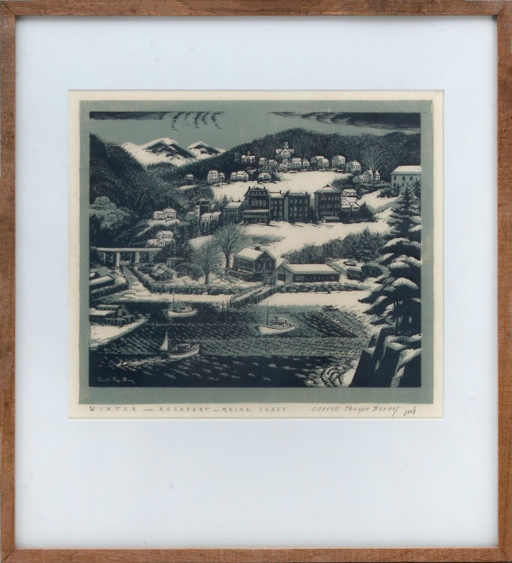 BERRY, Carroll Thayer, (American, 1886-1978): ''Winter, Rockport, Maine Coast, Woodcut, sight size 12'' x 13.5'', signed lower right, titled lower left, framed, 20.5'' x 19''.