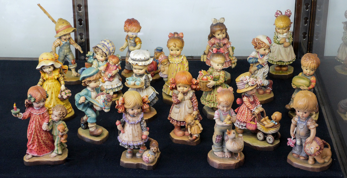18 SARAH KAY ANRI ITALIAN CARVED WOOD FIGURINES: An assembled collection of Anri carved polychrome decorated wood figures, all designed by Sarah Kay, each approx. 6 3/4'' h.