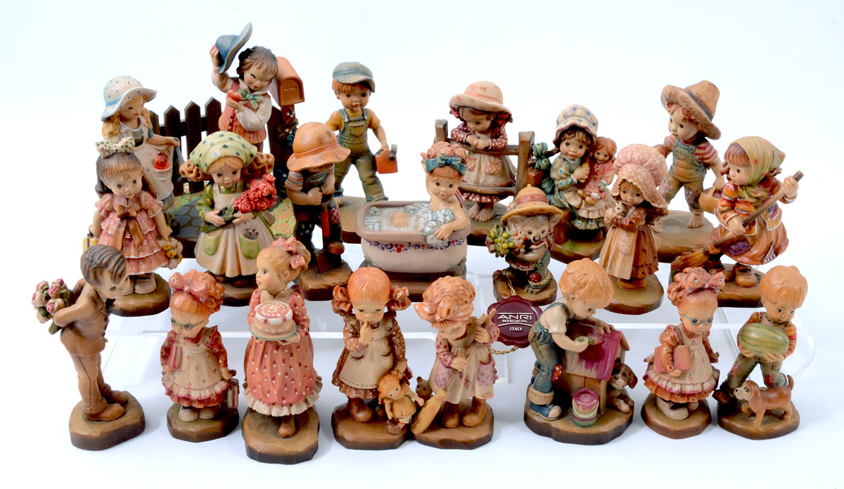21 SARAH KAY ANRI ITALIAN CARVED WOOD FIGURINES: An assembled collection of Anri carved polychrome decorated wood figures, all designed by Sarah Kay, each approx. 4'' - 4 1/4'' h.