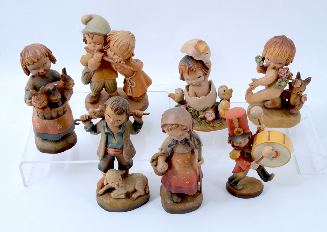 7 JUAN FERRANDIZ ANRI ITALIAN CARVED WOOD FIGURINES: An assembled collection of Anri carved polychrome decorated wood figures, all designed by Juan Ferrandiz, each approx. 5 3/4'' - 6 1/2'' h.