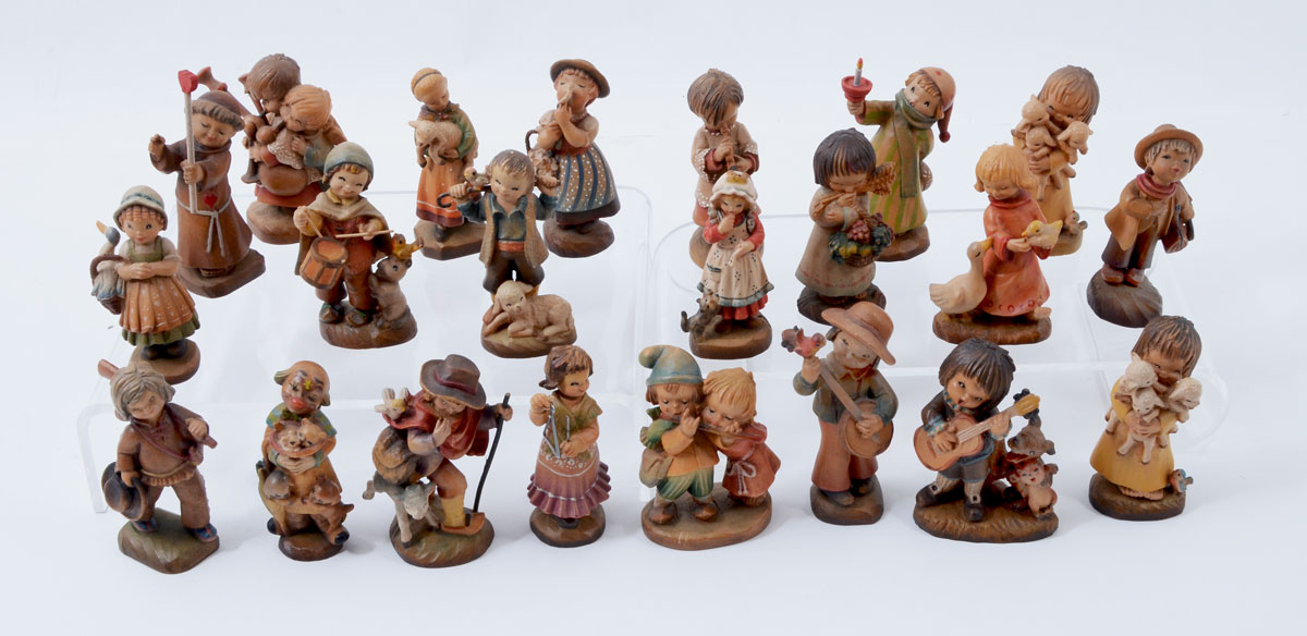 22 JUAN FERRANDIZ ANRI ITALIAN CARVED WOOD FIGURINES: An assembled collection of Anri carved polychrome decorated wood figures, all designed by Juan Ferrandiz, each approx. 3'' - 3 3/4''.